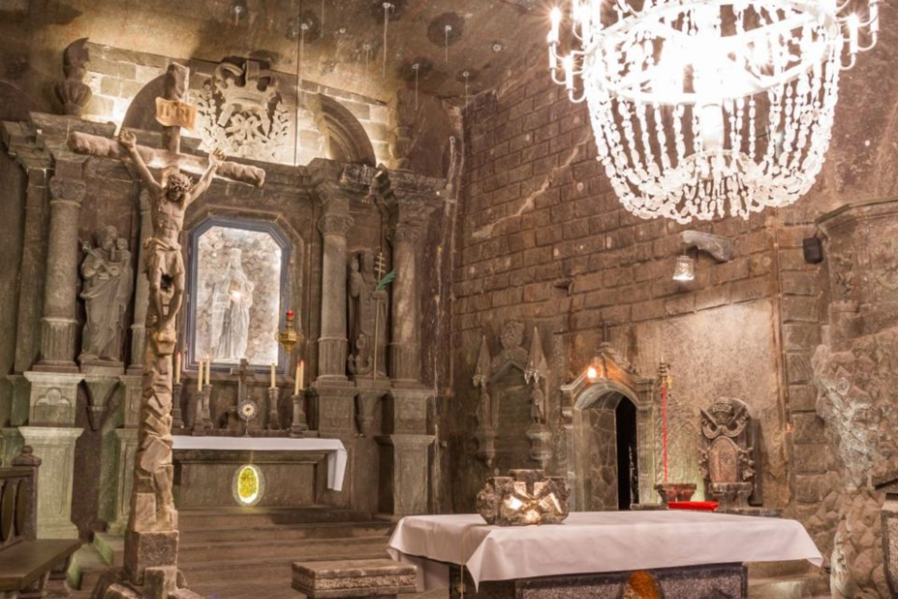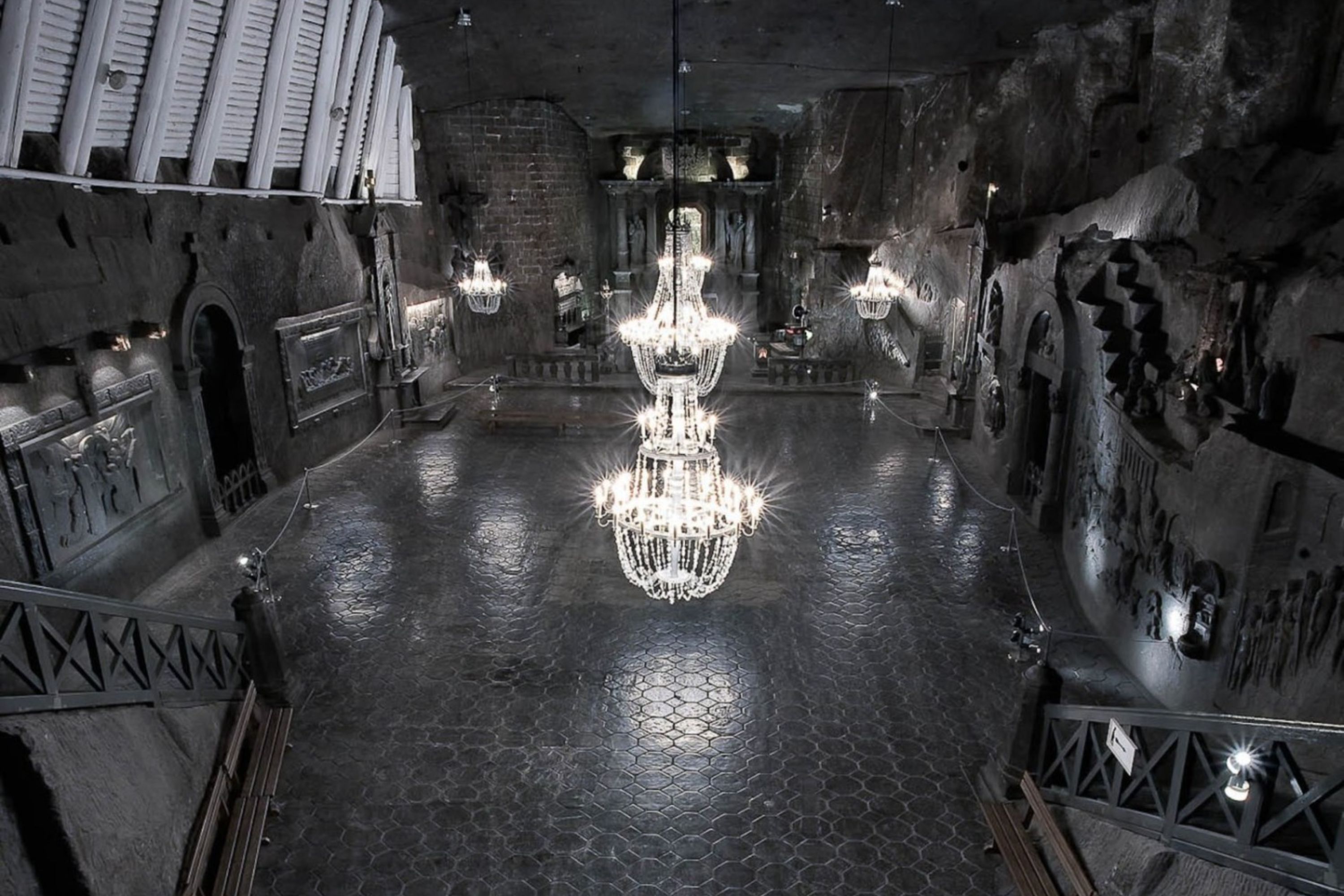 惊叹于盐矿的大厅,装饰着精美的盐雕雕塑和枝形吊灯