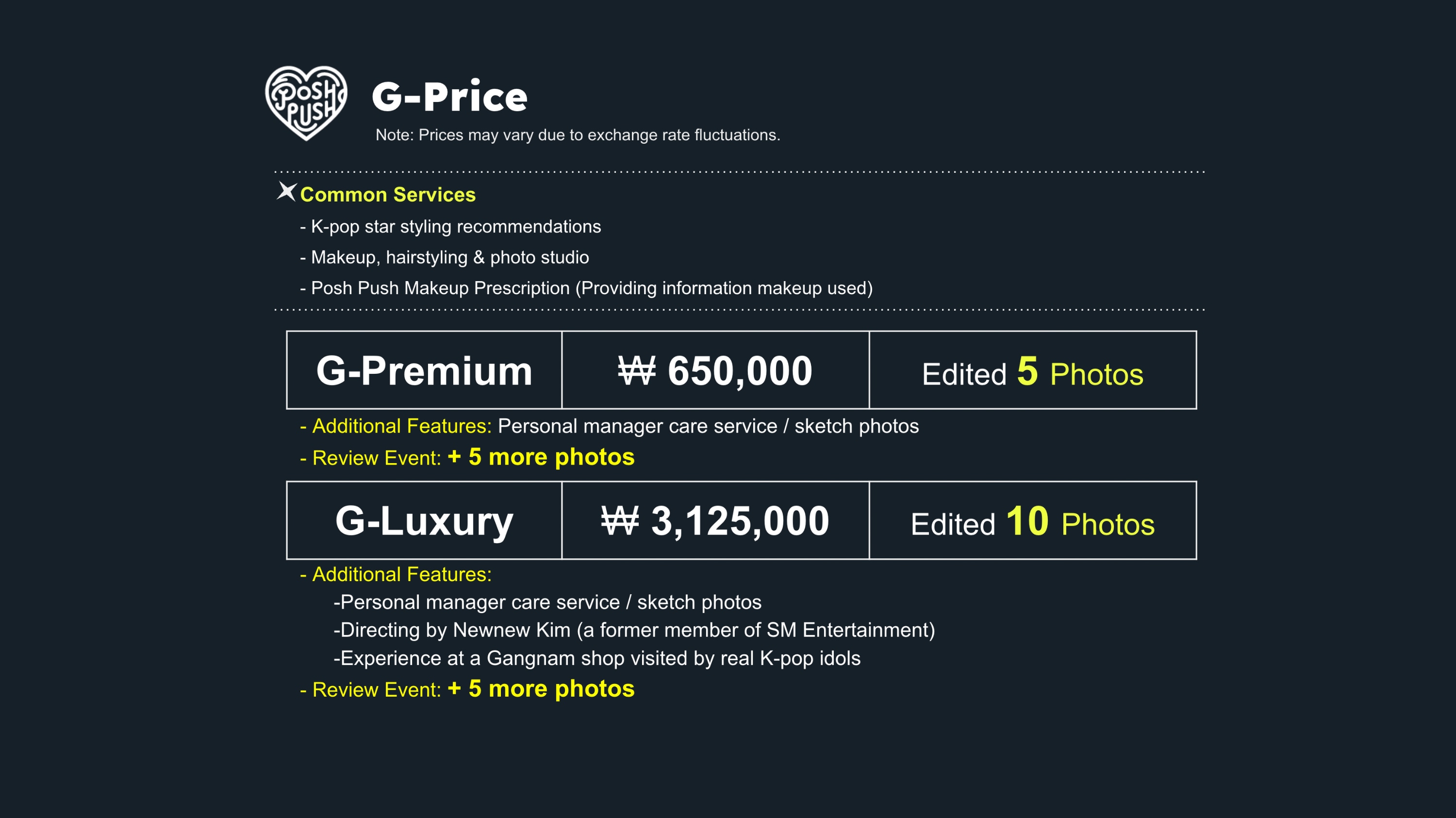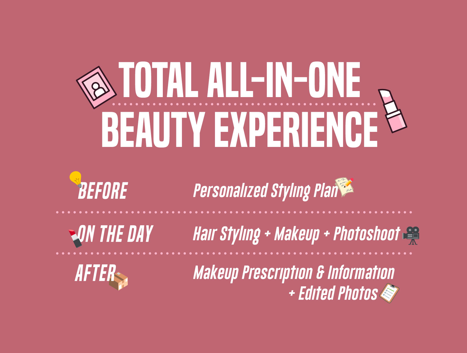 - 我们的独家套餐提供专业的**化妆、发型设计**和**拍照**,灵感来自您最喜欢的韩国偶像明星