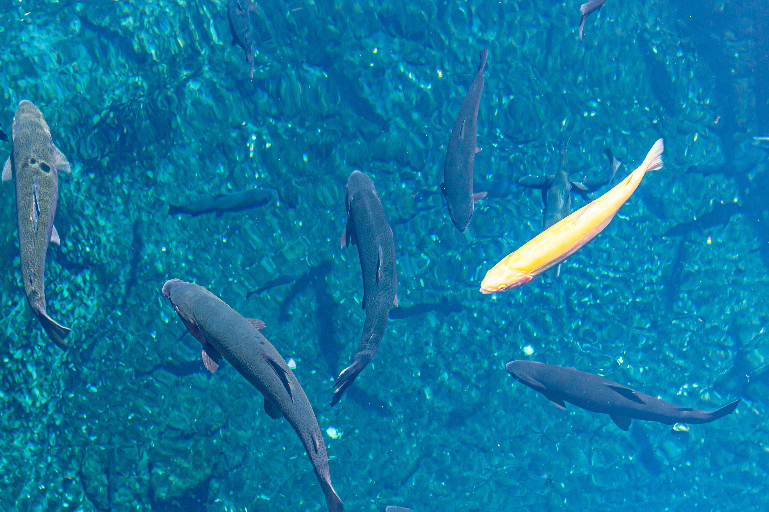 忍野八海的清泉中,锦鲤自由游弋~