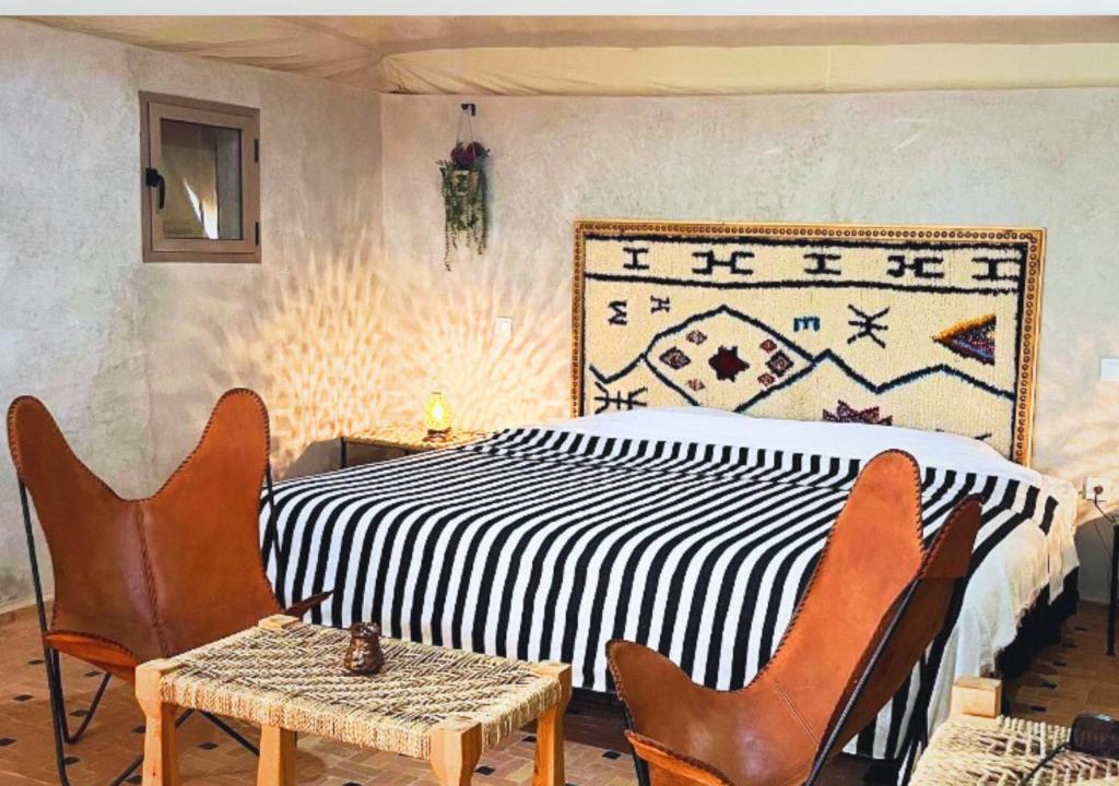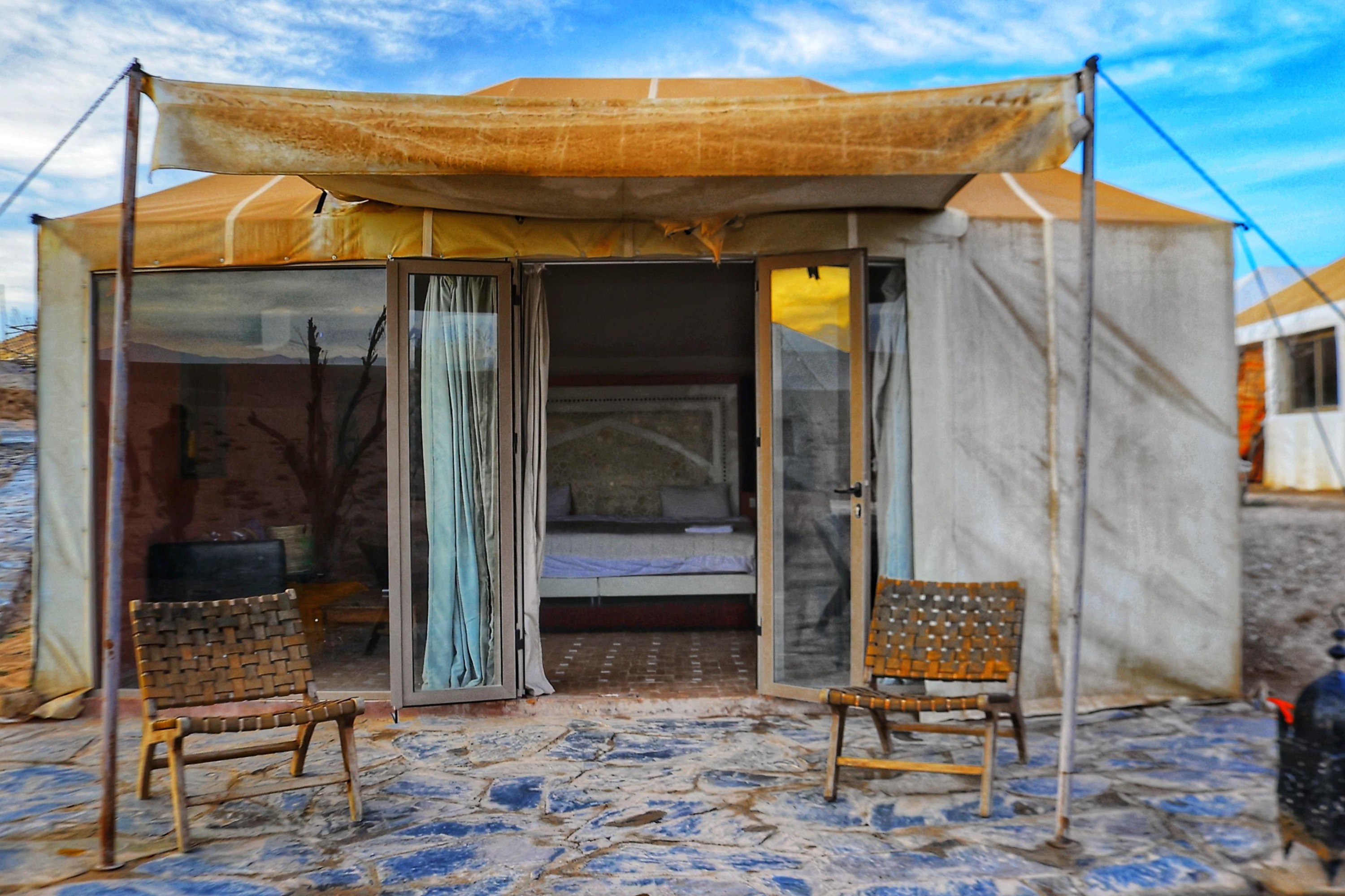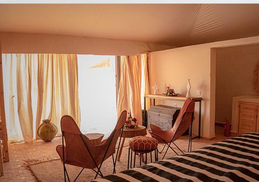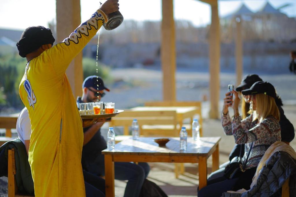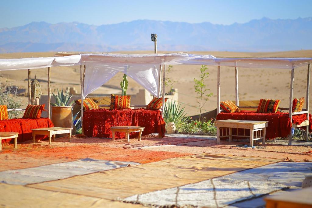 在约定的时间,我们将从您位于马拉喀什的酒店或里亚德接您,开始在阿加菲沙漠的独特体验。您的冒险之旅将从一小时的徒步旅行穿越令人惊叹的风景开始,最后在我们豪华的度假村享用清爽的迎宾茶结束。当夜幕降临时,您可以在星空下享用丰盛的私人晚餐,并享用当地和国际美食以及现场娱乐表演。在舒适的营火旁放松身心,凝视星空。