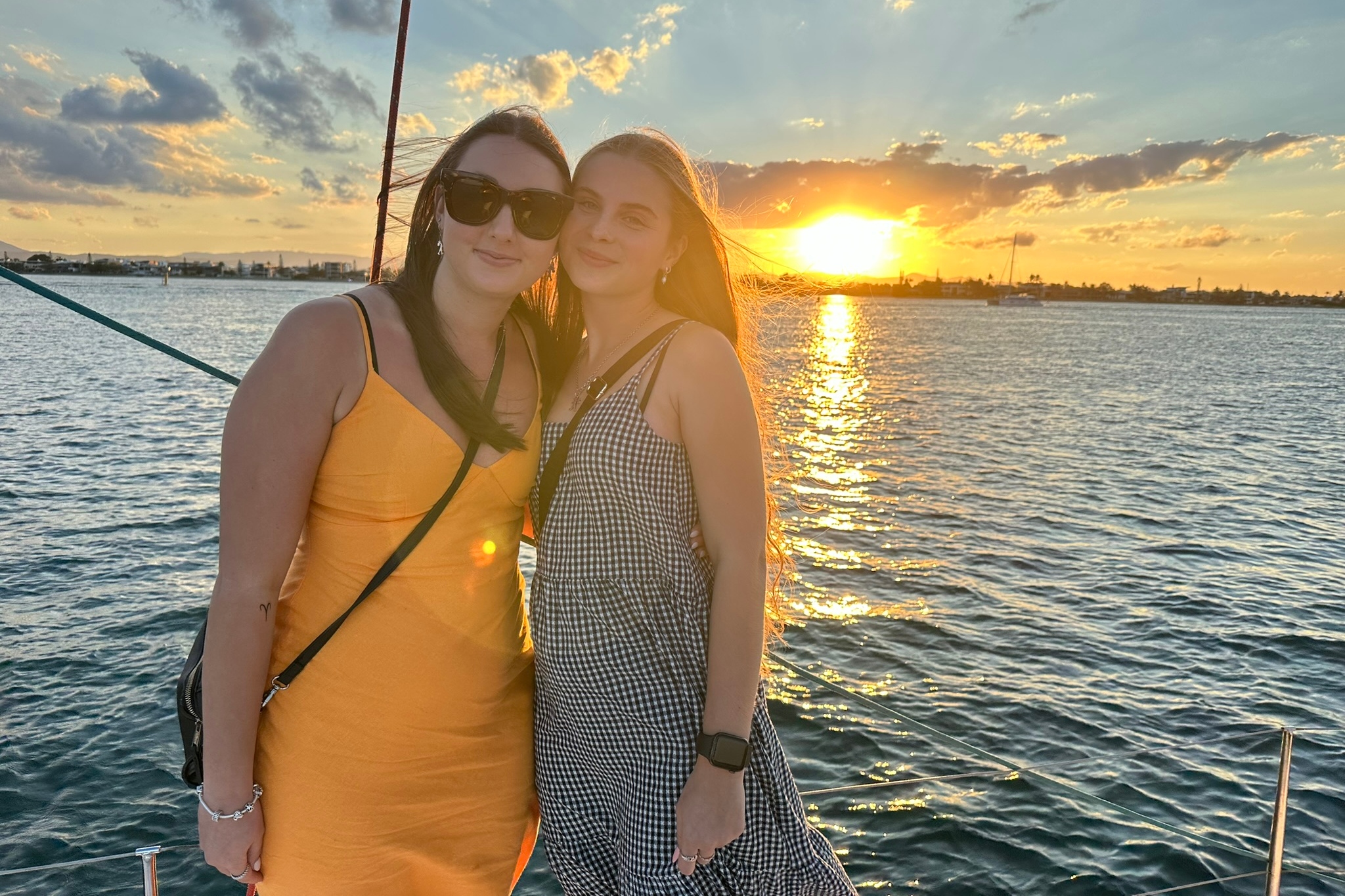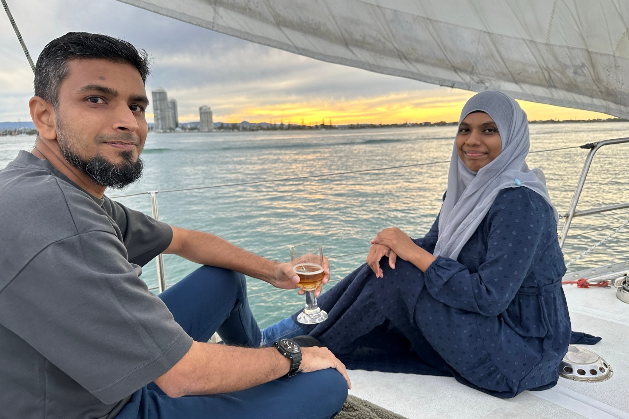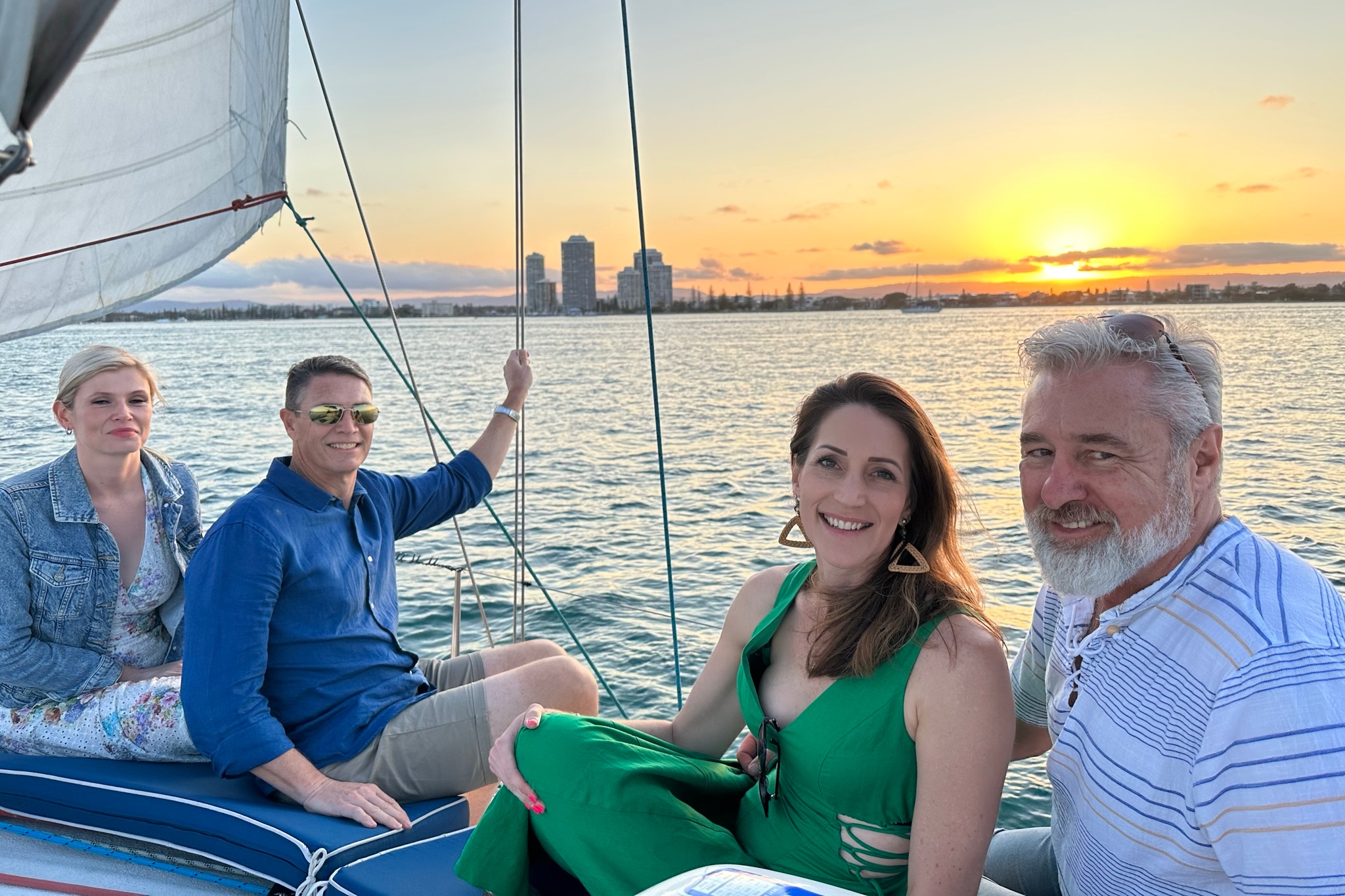 与朋友一起在黄金海岸的游艇上欣赏宁静的日落