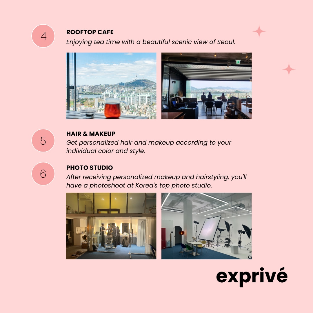 在韩国短暂停留期间,您可以参加 K Beauty Track,其中包括个性化的色彩咨询,以确定最讨人喜欢的化妆色调,并参与健康体验,发现您的本质。随后,接受定制的发型和化妆服务,然后进行专业摄影以记录效果。这种全面的体验有助于个人满足感和自我实现。此外,您还可以品尝各种韩国美食,在屋顶咖啡馆欣赏风景如画的首尔天际线,确保您在韩国度过完美的一日游。