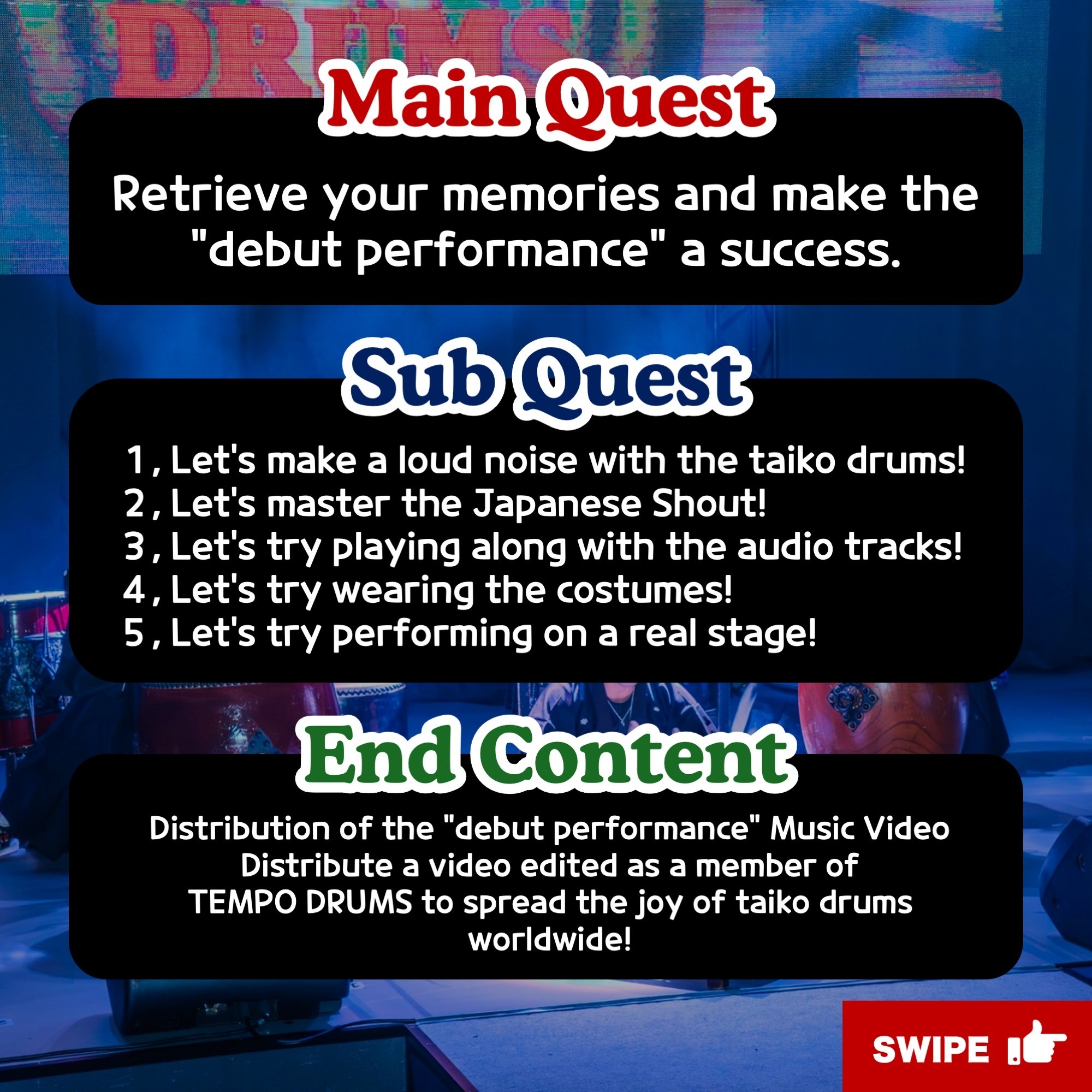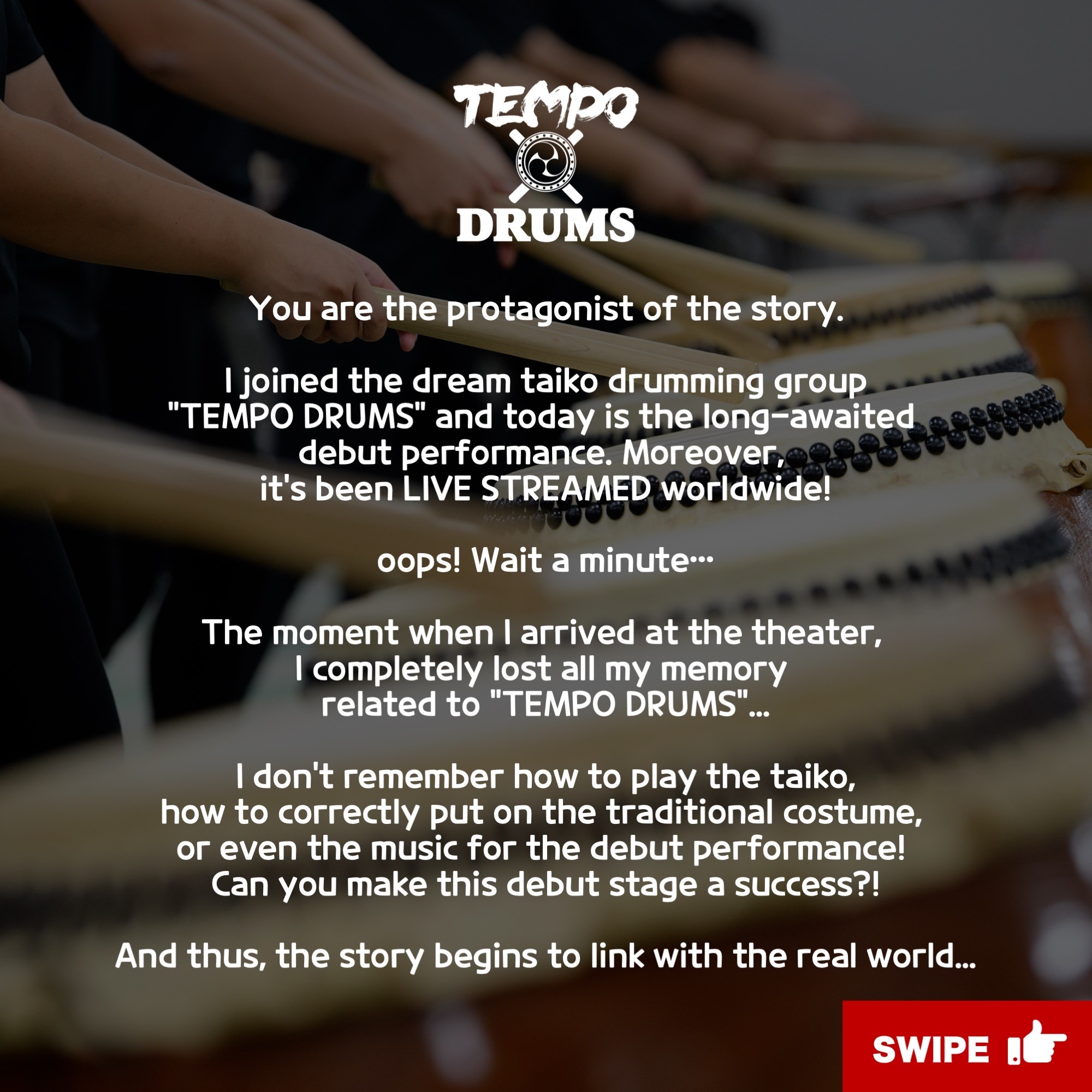什么是「WA」DAIKO RHYTHM QUEST?这是一个可以体验日本太鼓的独特工作坊!参与者被设定为失去记忆的日本鼓手,并被赋予在舞台上成功表演日本鼓的使命。最后,他们穿上戏服,登上戏院舞台表演。这是一种新颖的结构。此次表演的影片将被录制、编辑并呈现给参与者。最后,您可以与大家一起拍一张纪念照,作为回忆的一页。故事的主角是你。你加入了你所仰慕的日本鼓表演团体“TEMPO DRUMS”,今天是你期待已久的出道。然而,一到剧院,你就忘记了关于“TEMPO DRUMS”的所有记忆......你不知道如何打鼓,如何穿服装,也不知道你的首演歌曲!这次的首演能否获得成功呢?而这个故事与现实世界有连结。