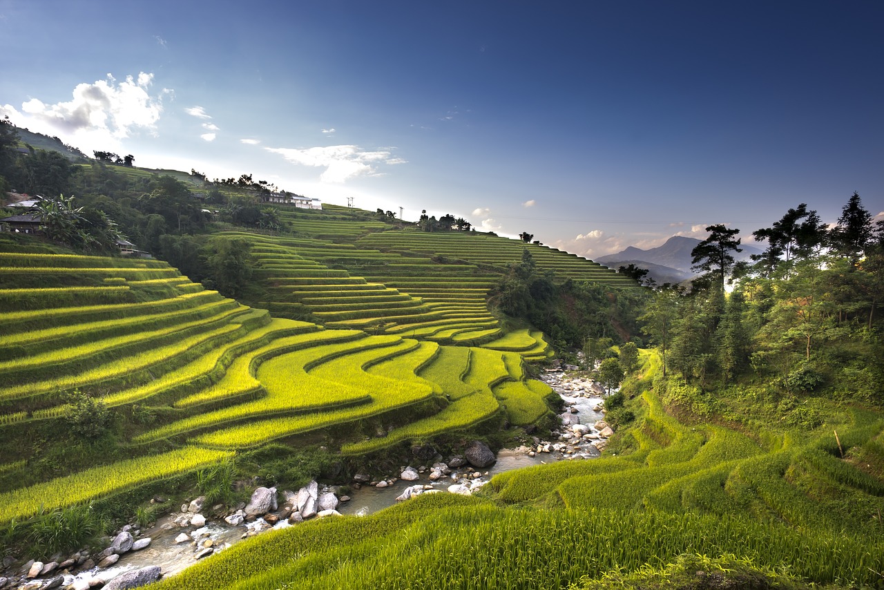 河江的绿色稻田