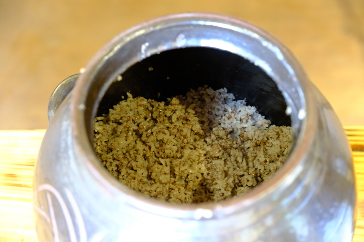 将糯米和酵母放入用稻草消毒过的韩国传统罐子中,然后发酵成清酒。