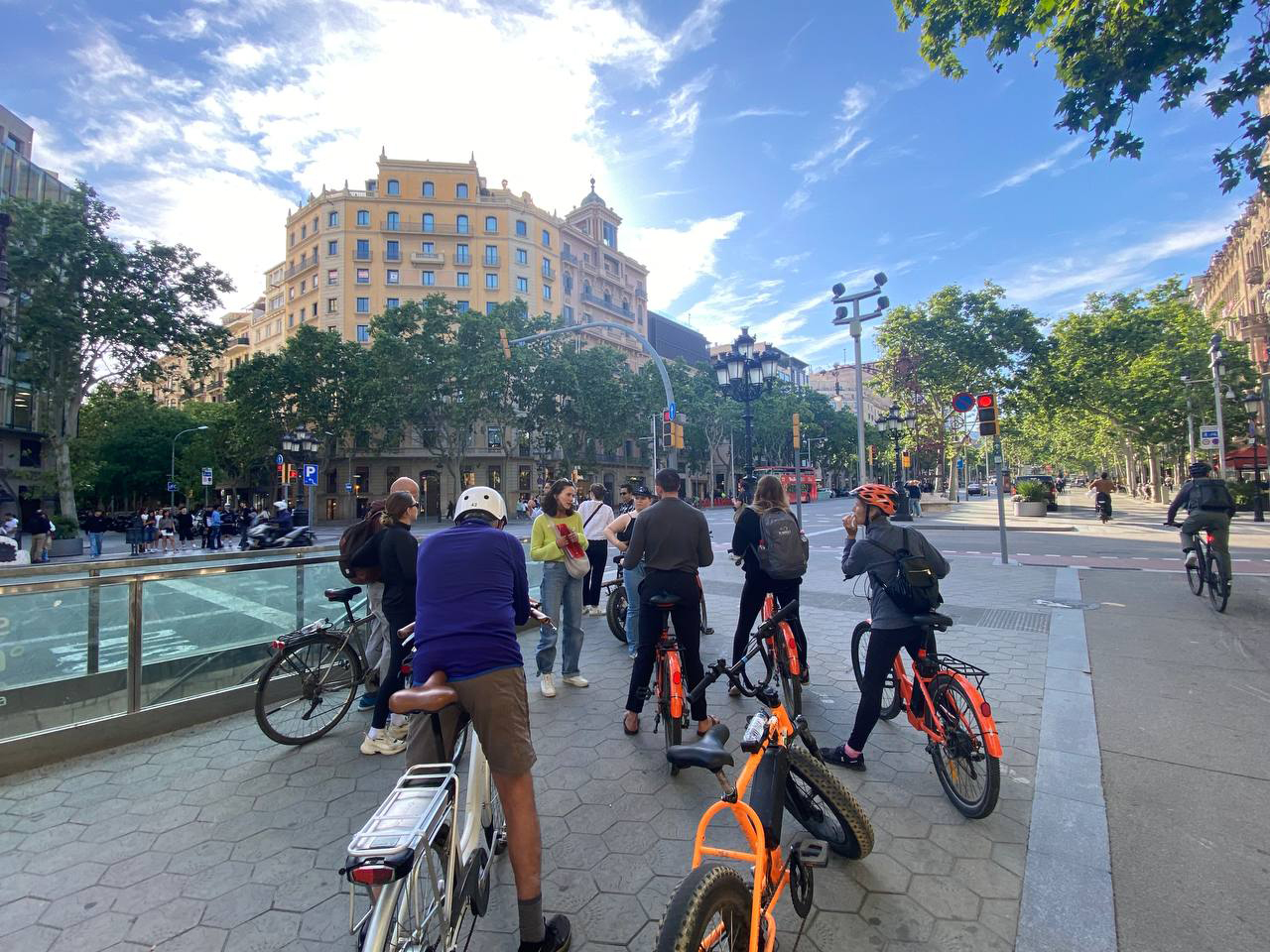当我们沿着城市繁华的主街兰布拉大街骑行时,我们沉浸在节日的气氛中