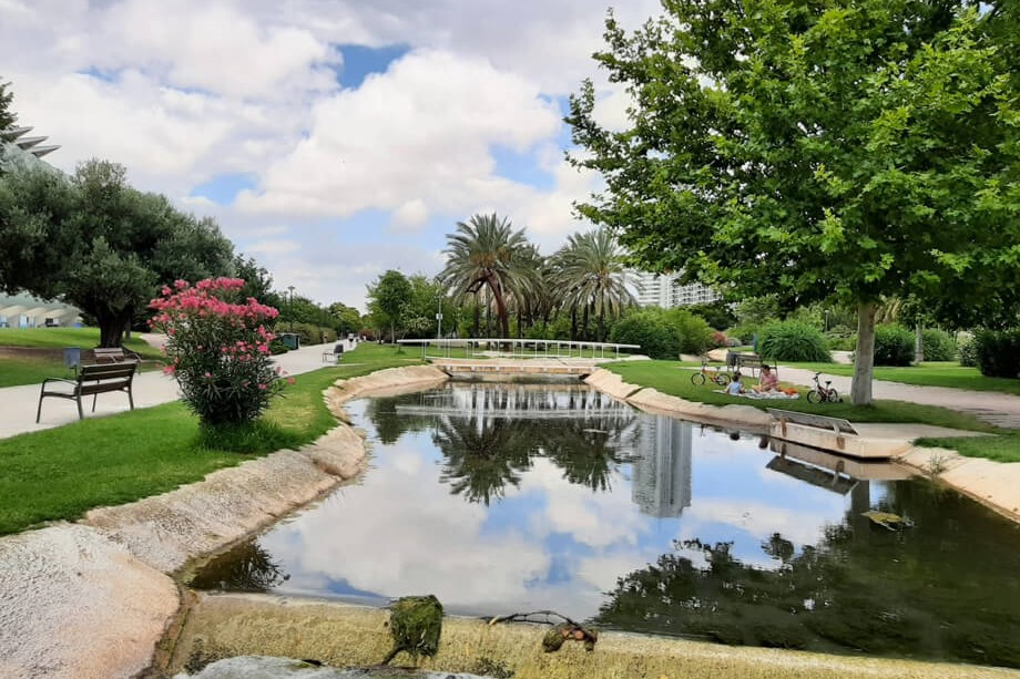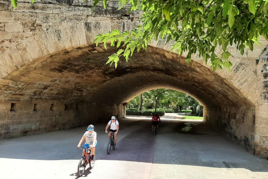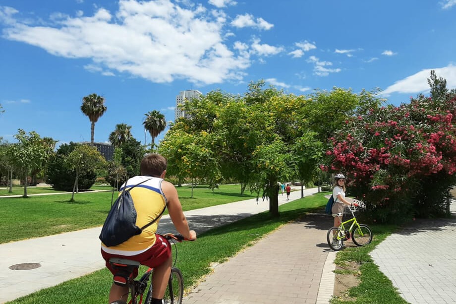 骑车穿过郁郁葱葱的图里亚花园,这是瓦伦西亚市的一片绿洲