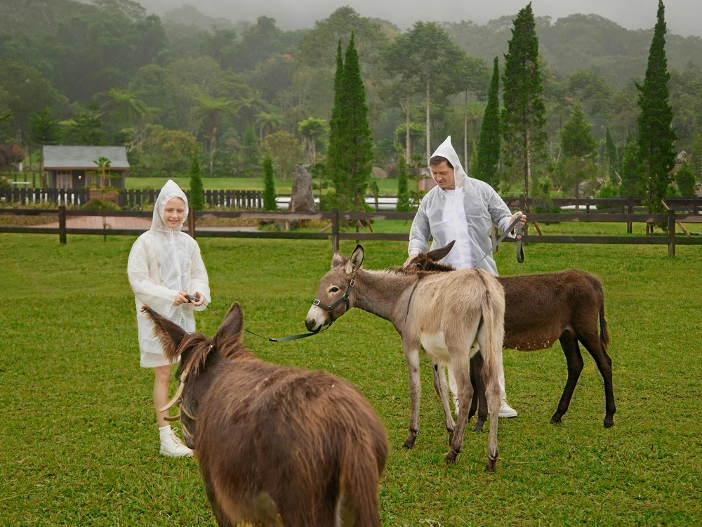 在友好的羊驼和顽皮的驴子中间分享美味佳肴。这是全家人充满温馨时刻的一天