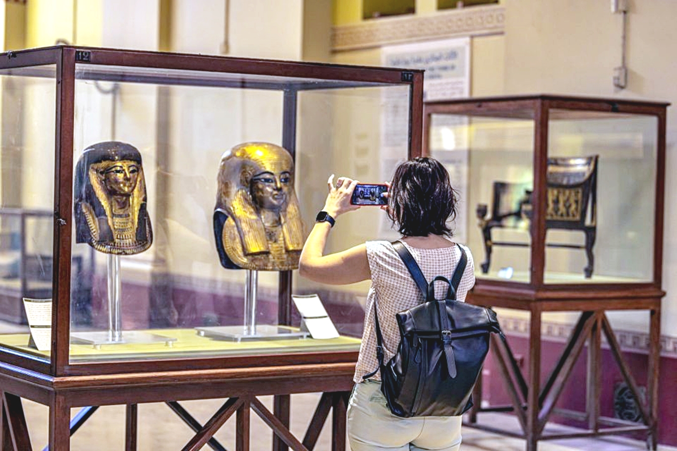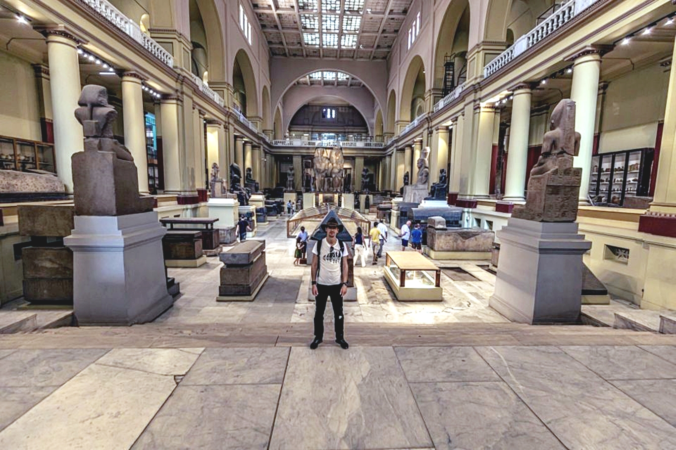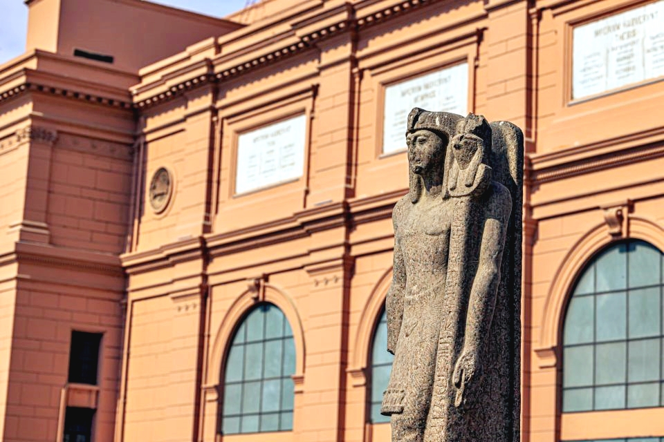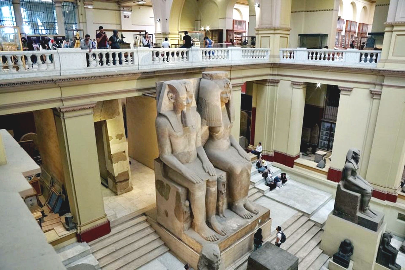 在开罗,在解放广场的埃及博物馆与埃及古物学家导游会面,了解古埃及的木乃伊制作艺术。