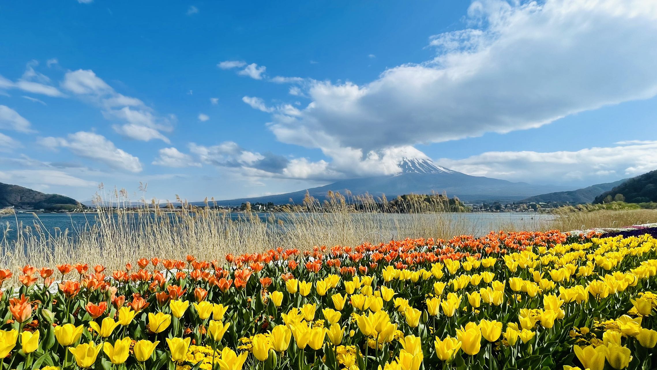 春天河口湖畔,色彩斑斓的花海浪漫绽放~