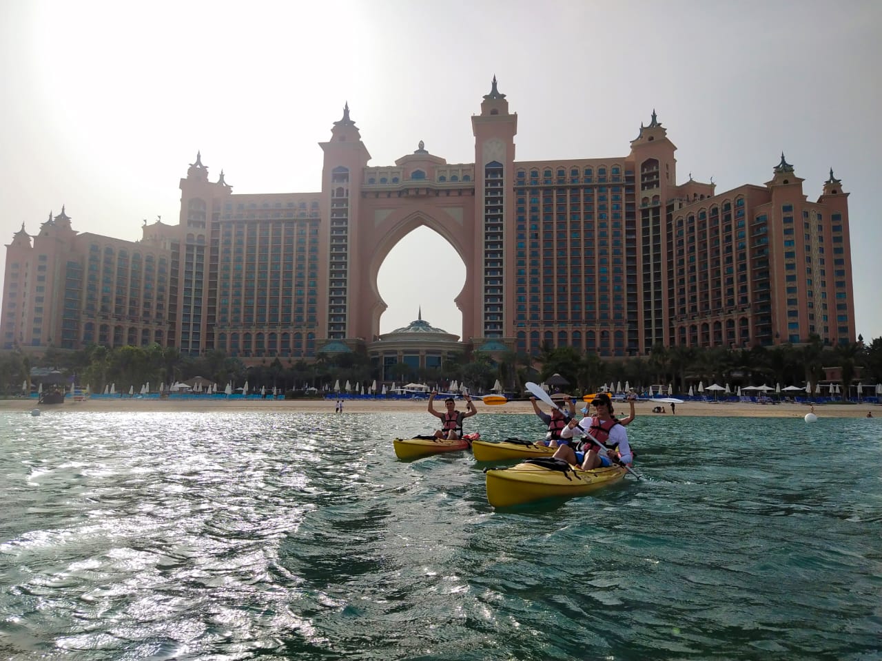 划桨近距离经过世界知名酒店,如亚特兰提斯皇家酒店、亚特兰提斯酒店和百万富翁行。
