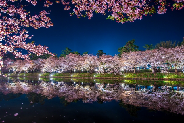 弘前市的樱花灯会是一年一度的盛大庆典,尤其以弘前公园周围的河岸樱花点灯景观而闻名。每年春季,弘前公园内的樱花树和附近的河流两旁都会点亮温暖的灯光,营造出浪漫、梦幻的夜景