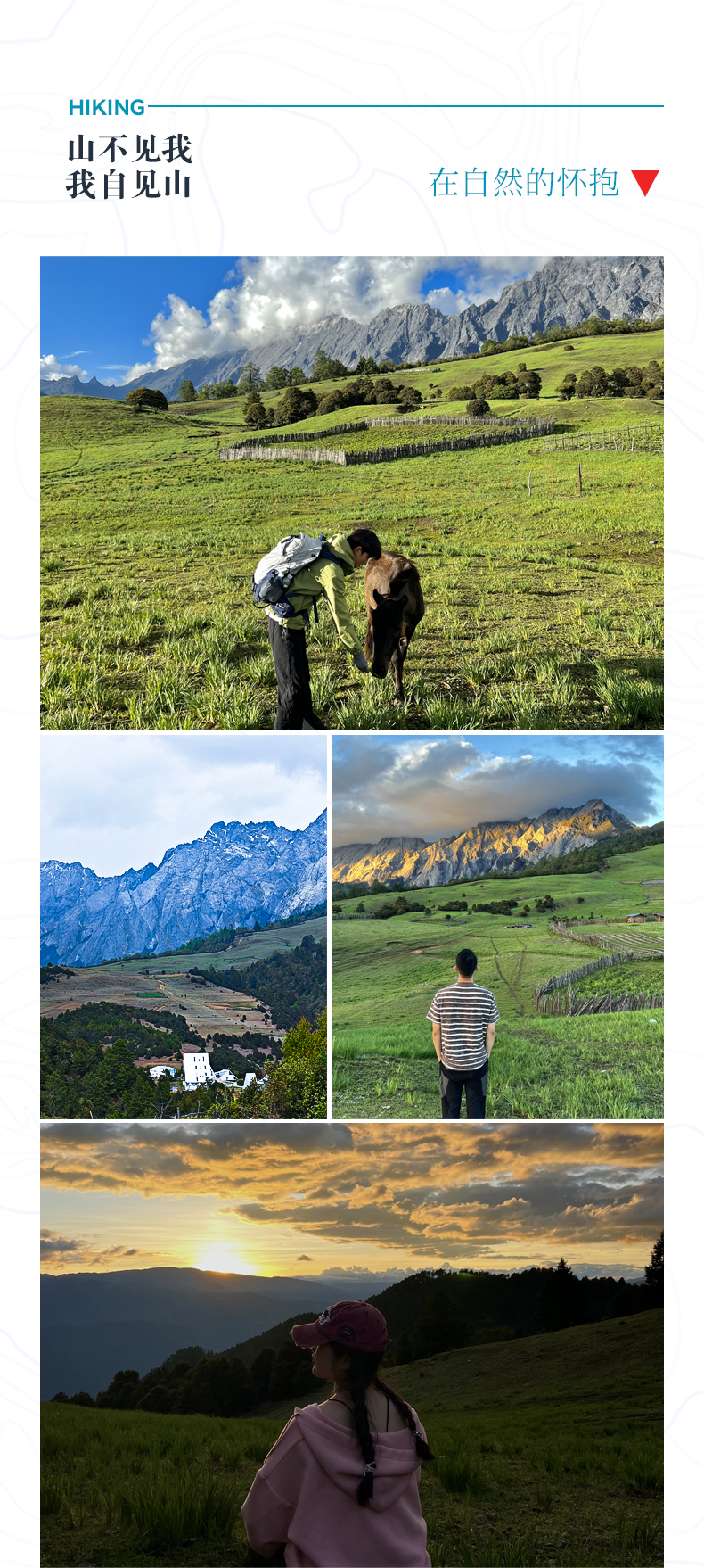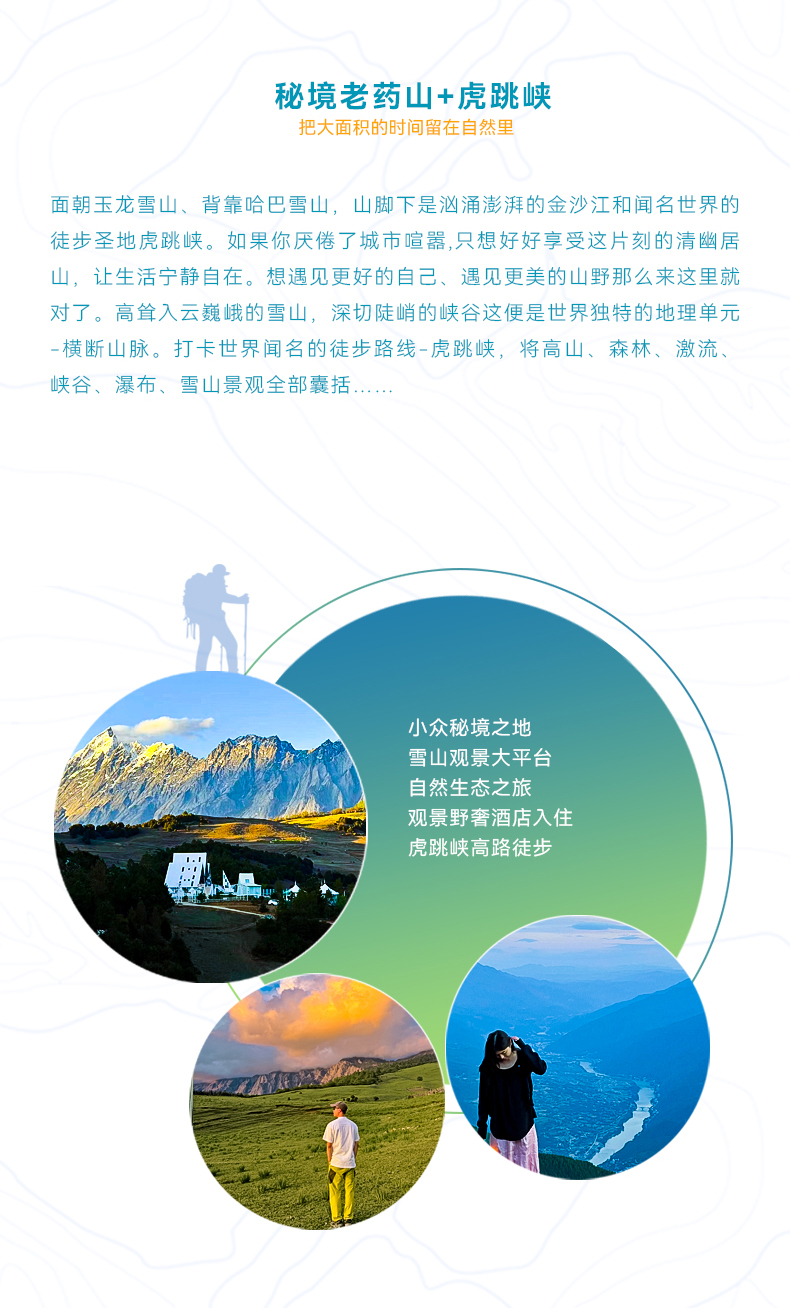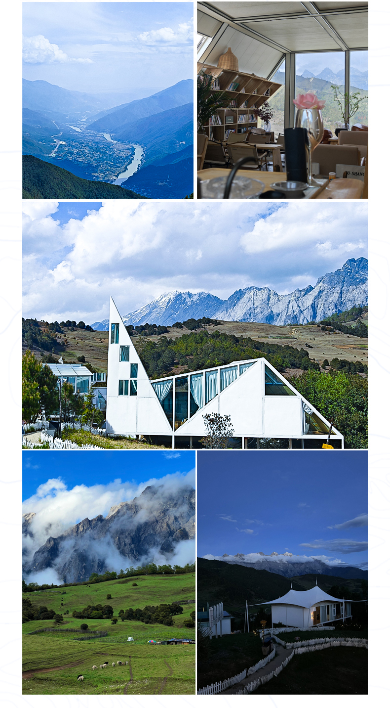 面朝玉龙雪山、背靠哈巴雪山,山脚下是汹涌澎湃的金沙江和闻名世界的徒步圣地虎跳峡。如果你厌倦了城市喧器,只想好好享受这片刻的清幽居山,让生活宁静自在。想遇见更好的自己、遇见更美的山野那么来这里就对了。高耸入云巍峨的雪山,深切陡峭的峡谷这便是世界独特的地理单元-横断山脉。打卡世界闻名的徒步路线-虎跳峡,将高山、森林、激流峡谷、瀑布、雪山景观全部囊括。