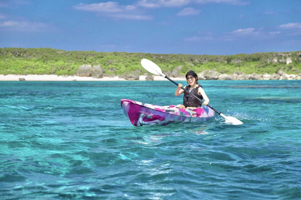 搭乘独木舟前往石灰岩洞穴,这是宫古岛壮观海滩上稳定性极佳的标准活动!
