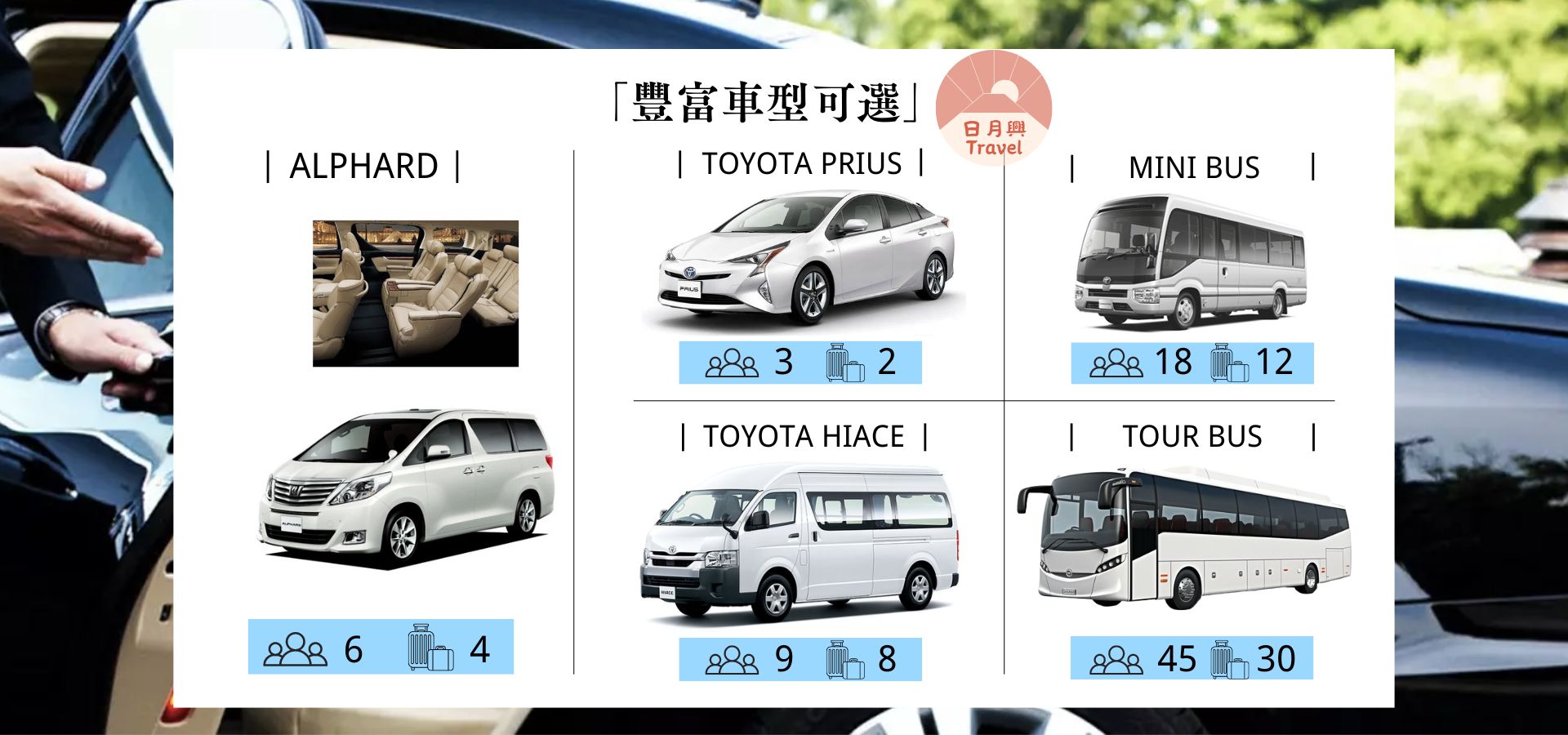提供丰富车型选择,满足各种家庭游、公司旅行及商务需求,让您享受舒适便捷的旅游体验。