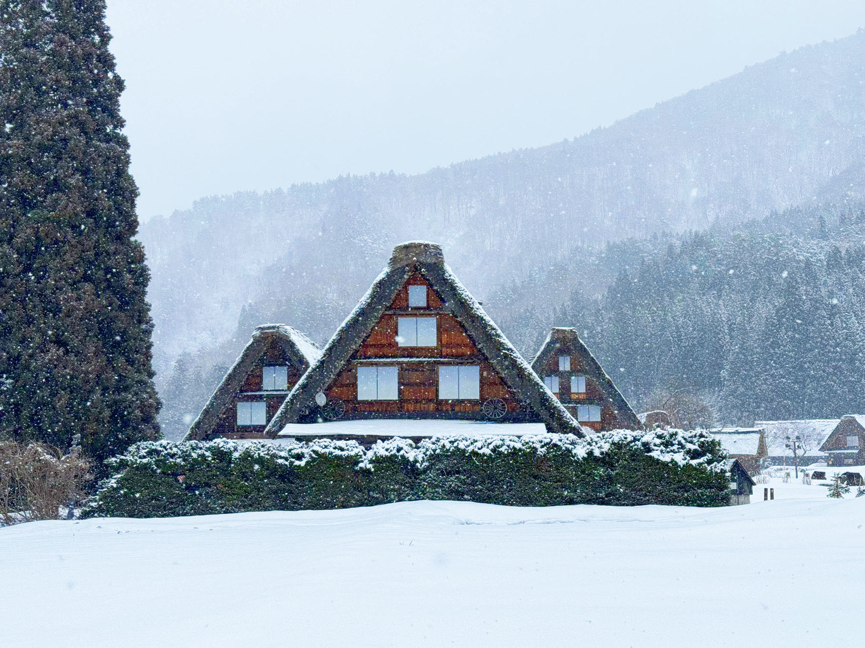 雪覆合掌造建筑:冬季,白川乡的合掌造房屋被厚厚的积雪覆盖,形成独特的白色景观。这些茅草屋顶设计特别适合在大雪中保持稳定,雪覆盖的屋顶犹如童话中的小屋,令人惊叹。