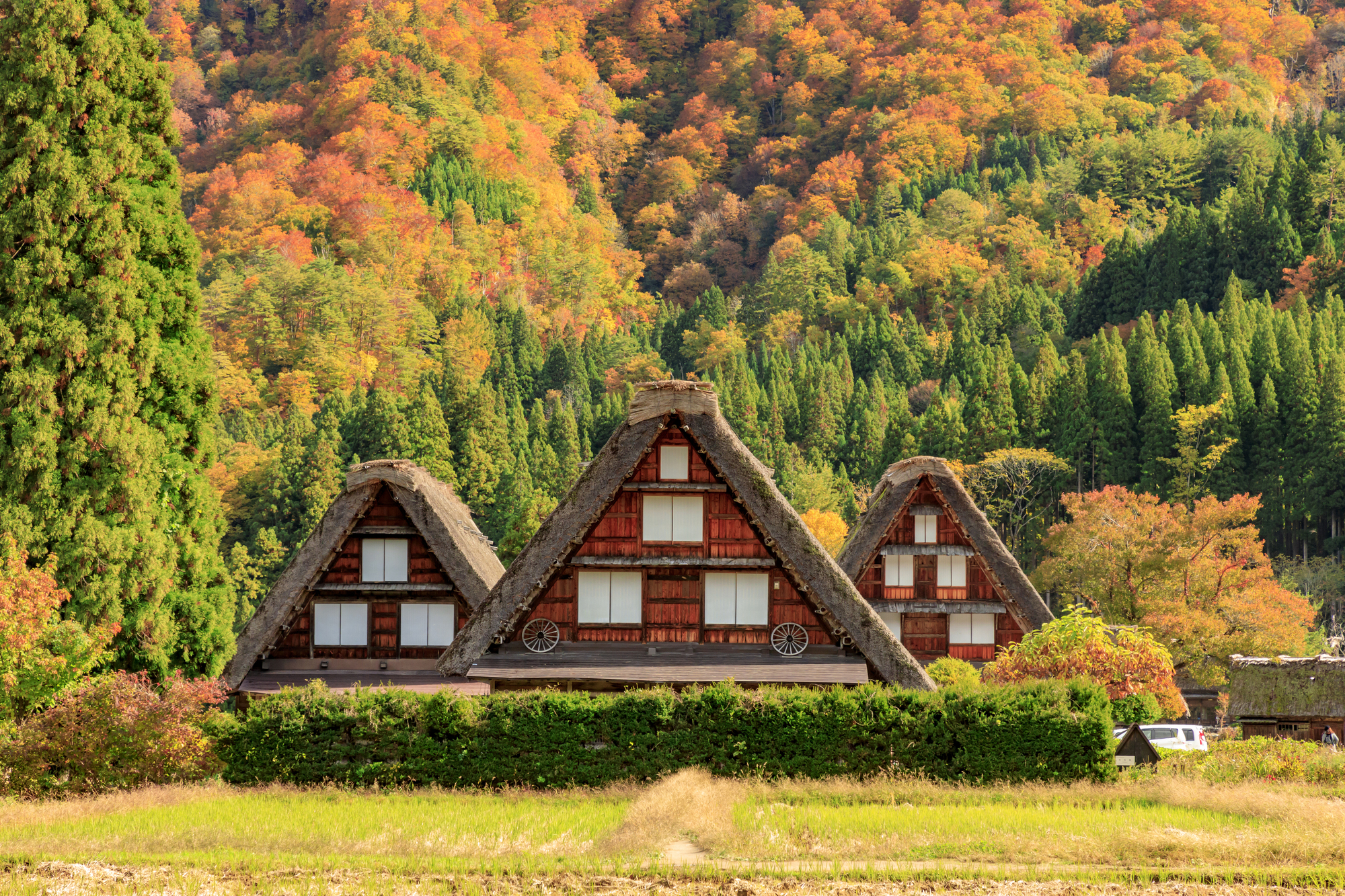 【白川乡秋季】这些传统建筑物的屋顶以陡峭的角度建造,使得雪能够轻易滑落,防止屋顶塌陷。这种设计反映了当地人适应严酷冬季环境的智慧。