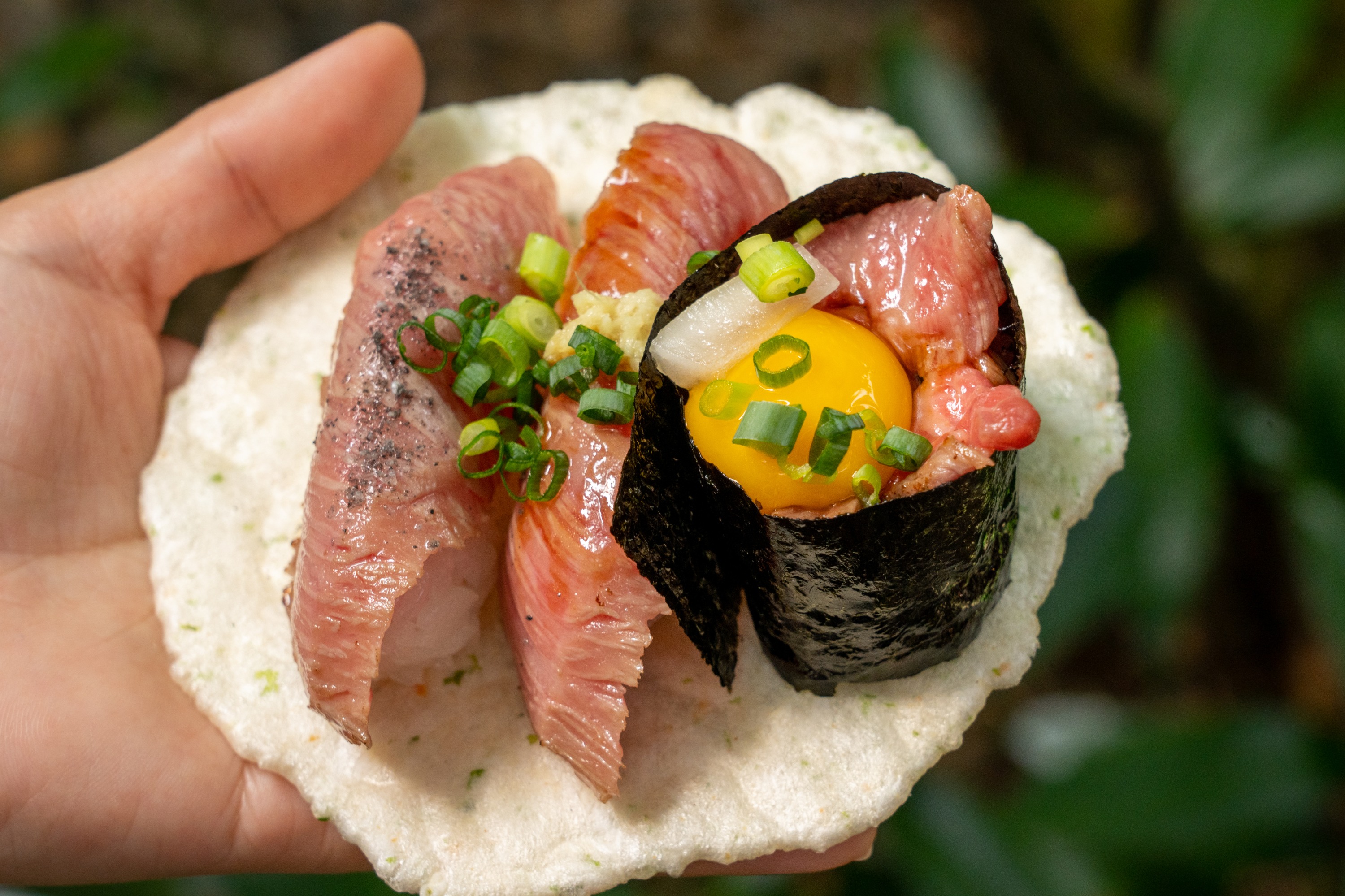 【飞驒高山牛肉寿司】这是日本岐阜县飞驒高山地区的一道特色美食,结合了当地著名的飞驒牛肉和传统的寿司制作技艺。飞驒牛以其柔嫩多汁、风味独特而闻名,而将其制作成寿司,则带来了口感和风味的双重享受。
