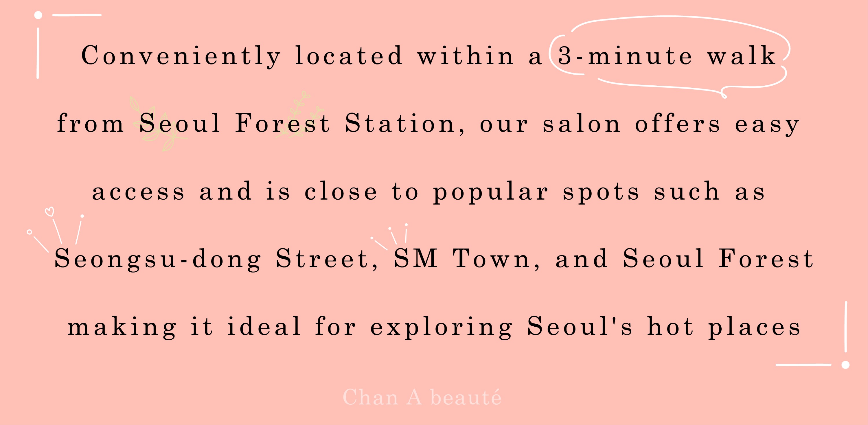 在我们专属的一对一护理沙龙享受客制化美容体验,该沙龙距离首尔森林站仅 3 分钟步行路程。我们的沙龙地理位置优越,靠近时尚的圣水洞街、SM 城和首尔森林,是探索首尔充满活力的热门景点的理想休息场所。让我们经验丰富的主任为您提供专业、个人化的护理,展现您最美丽的自我。在我们原始、宁静的环境中放松身心,恢复活力,消除旅程的疲劳。
