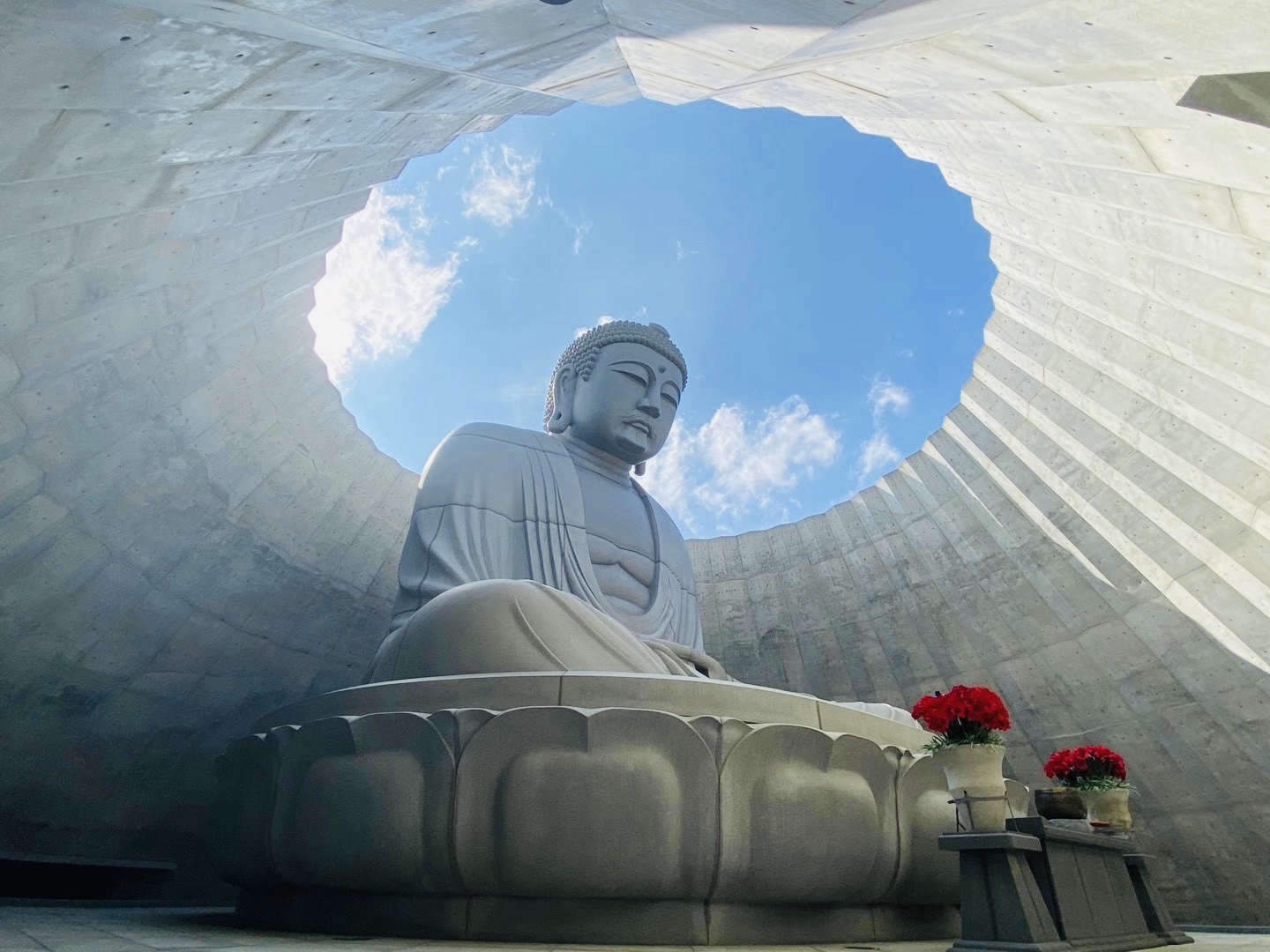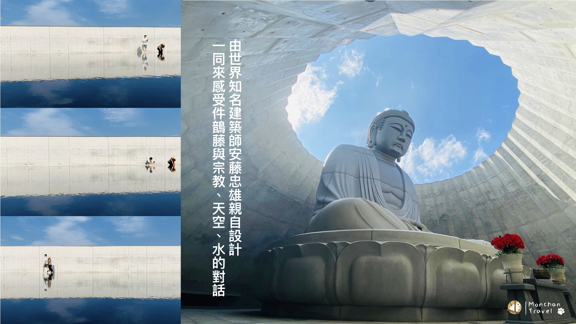 这座大佛由世界知名建筑师安藤忠雄亲自设计。运用地形,使大佛巧妙隐身在地势中,只能看见佛像的头部,而穿过隧道后,才能一览庄严的佛像全身,由下往上欣赏时更能看见佛像背后的蓝天。