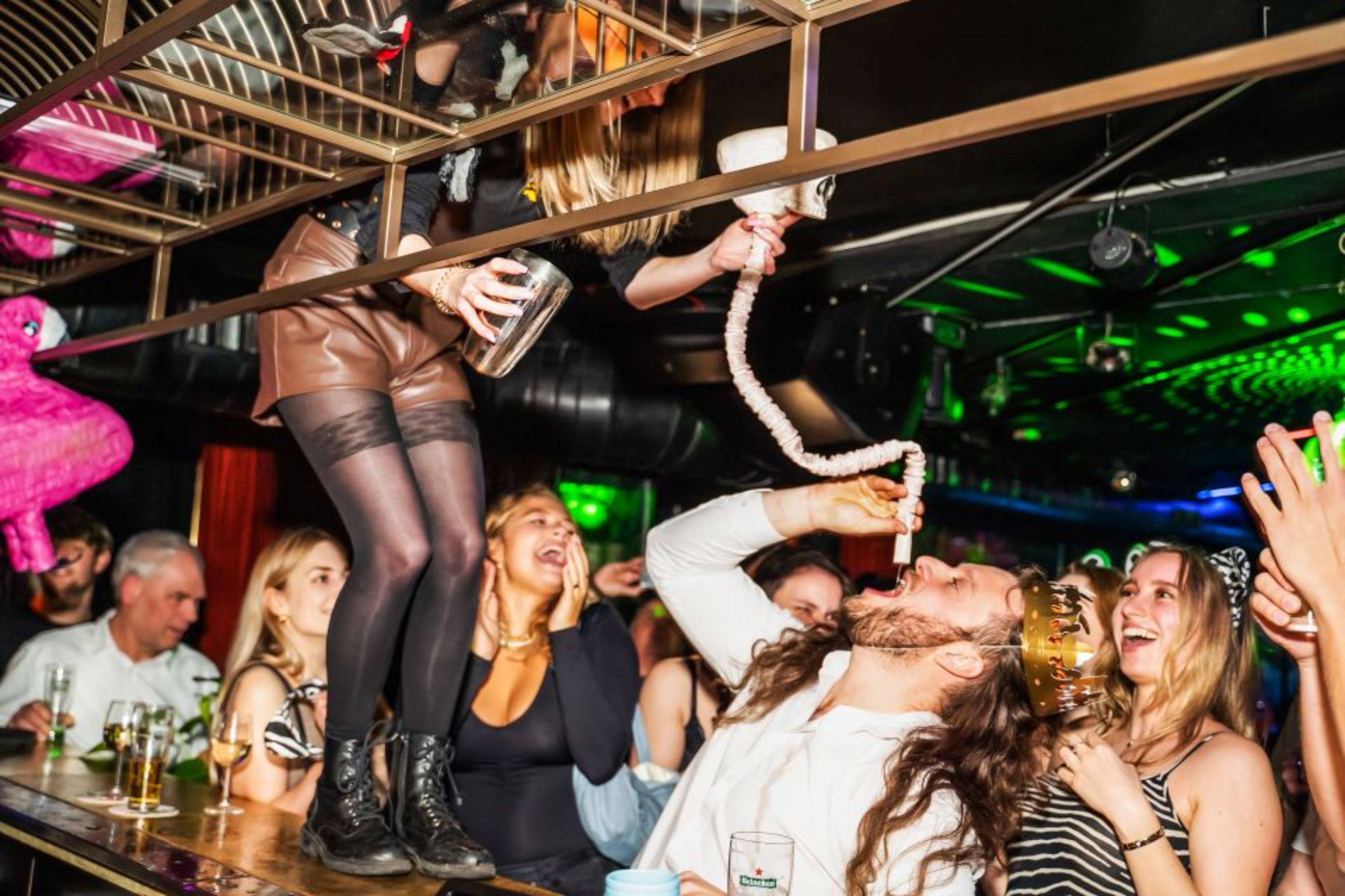 整个晚上参与有趣的饮酒游戏和热闹的舞蹈比赛