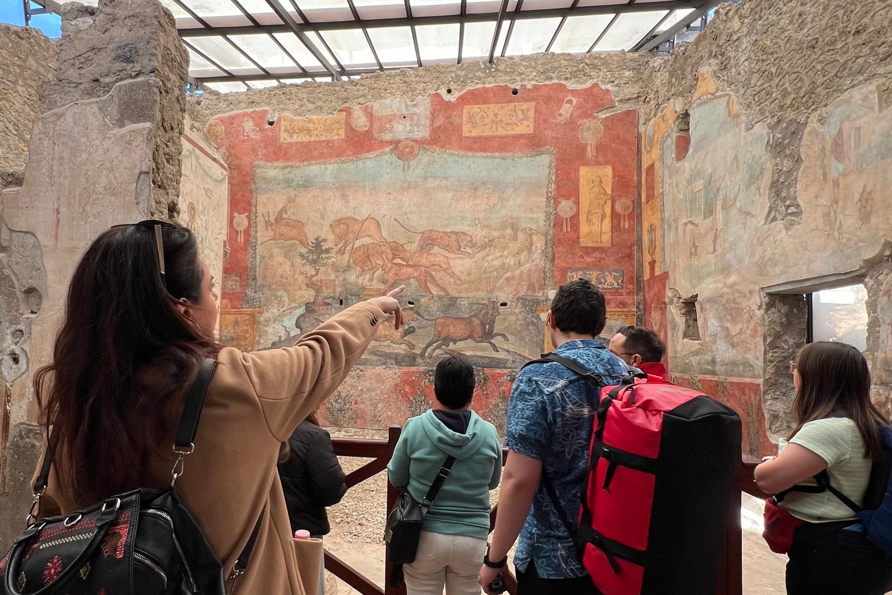 考古导游将在停车场迎接您并协助购买门票。然后您将探索一些重要景点,如温泉浴场、大教堂和拥有令人回味壁画的卢帕纳雷妓院。这次旅行还包括在马塞勒姆 (Macellum) 和农牧之家 (House of Faun) 停留。在整个过程中,短暂停留期间将有机会拍照。