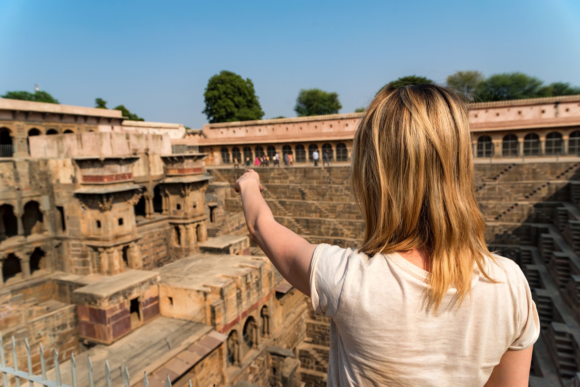 一位女旅行者指着著名的阶梯井 Chand Baori。