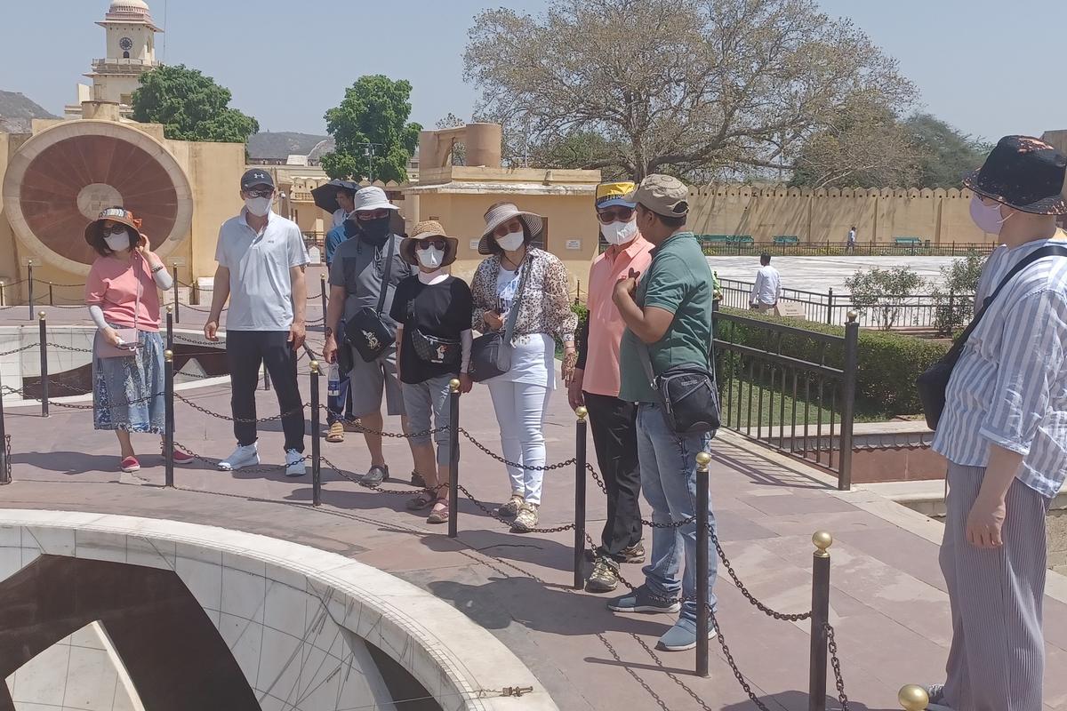 游客们正在斋浦尔与我们的导游一起观看简塔·曼塔尔天文台。