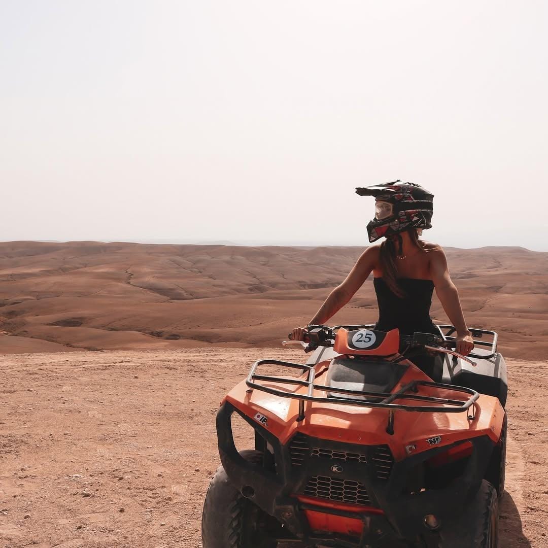 乘坐四轮摩托车和骑骆驼探索阿加菲沙漠,包括从马拉喀什任何住宿地出发的往返交通。享受午餐、游泳池和令人惊叹的沙漠景观