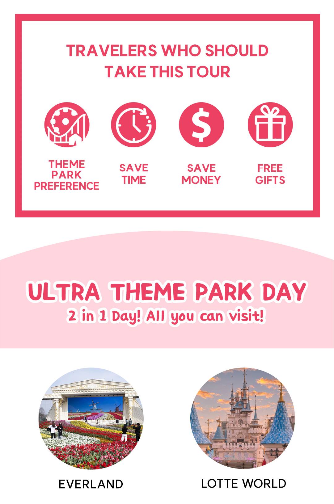 只需一天,即可畅玩韩国排名前两的游乐园! 这将是您在韩国顶级游乐园度过完美一天的绝佳选择!