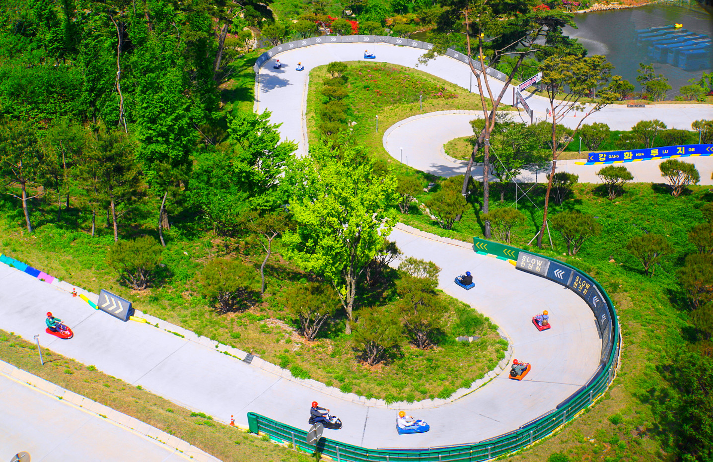 江华岛斜坡滑车的滑道总长1.8公里/条,拥有两个赛道(海洋赛道和山谷赛道),是亚洲赛道规模最大的。