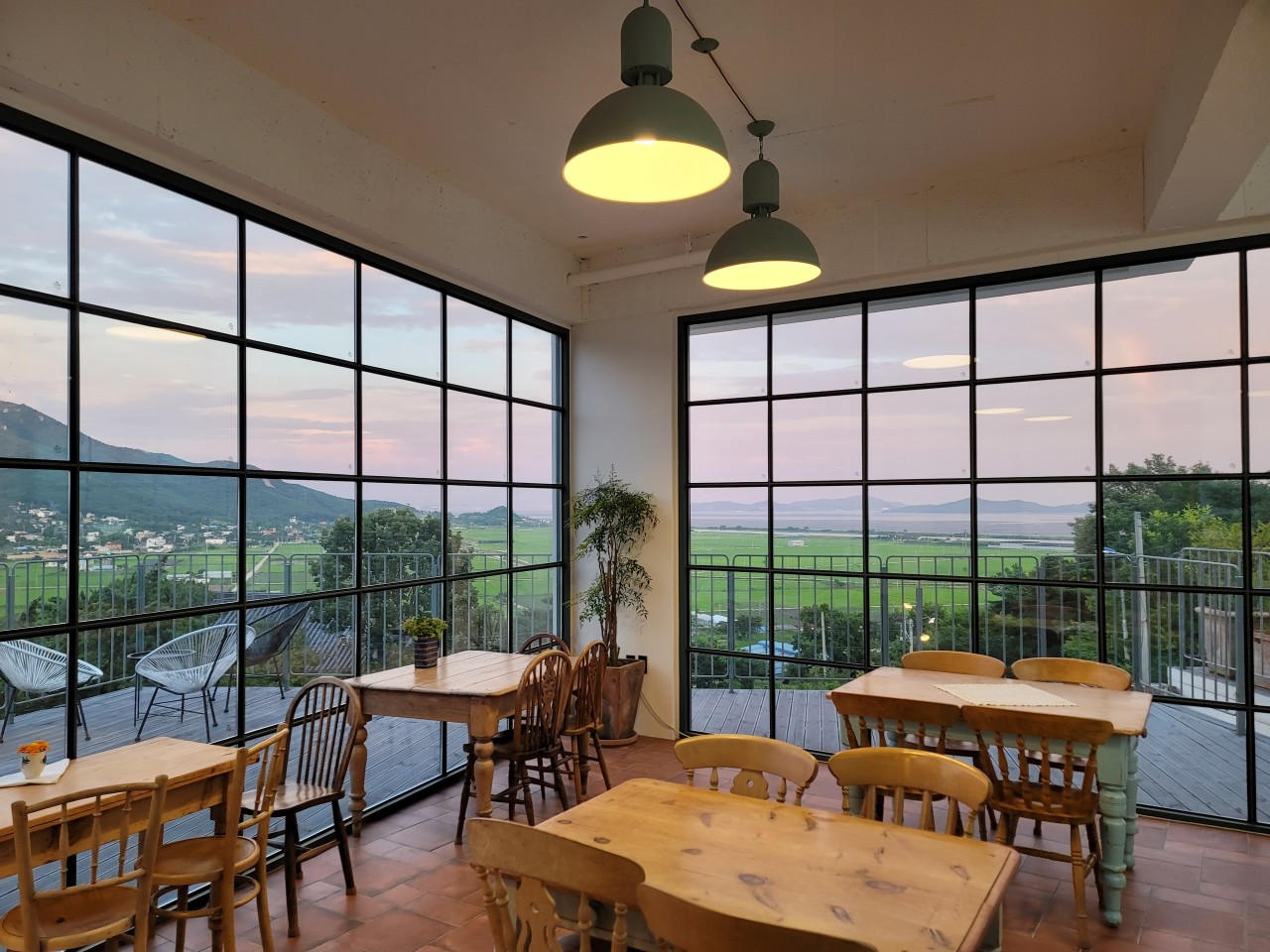 位于江华岛的mung-hit咖啡厅内部设有大窗户,可以一边喝咖啡一边欣赏江华岛美丽的森林景色。这里也是Netflix电视剧《光荣》的拍摄地。
