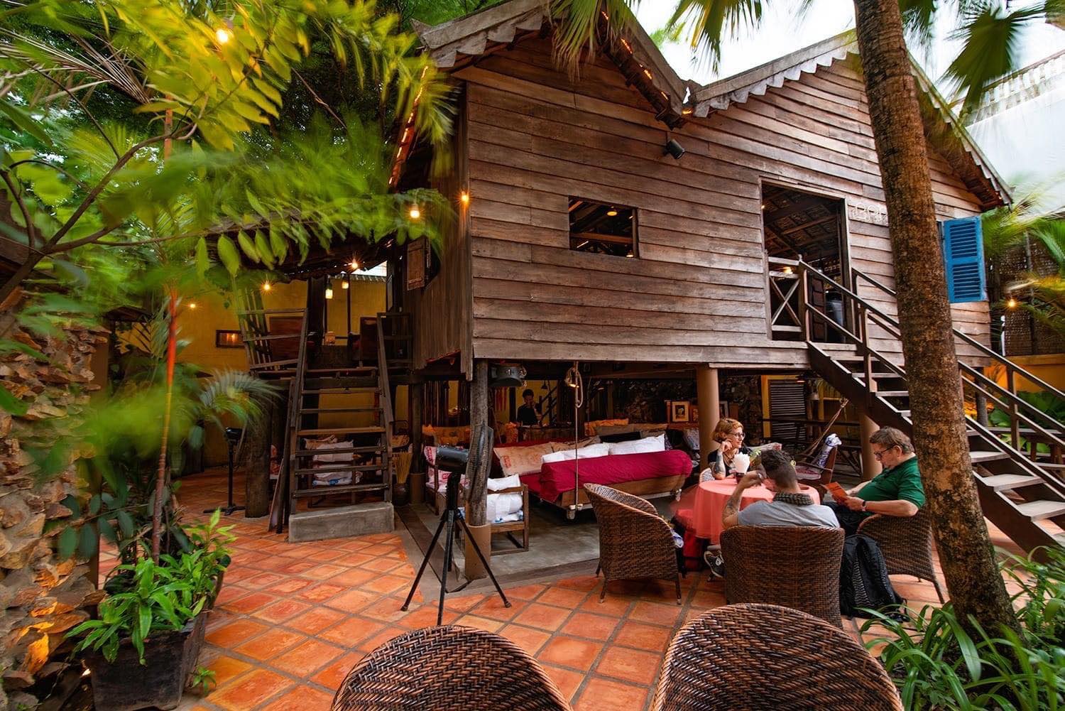 在 OLD KHMER WOODEN HOUSE BAR 品尝当地啤酒。