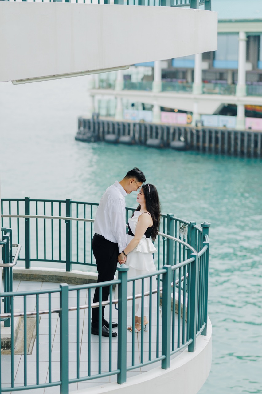在中环码头进行浪漫的照片拍摄,捕捉香港的精髓,这里迷人的海滨景色和繁华的城市天际线为您的爱情故事创造了完美的背景。
