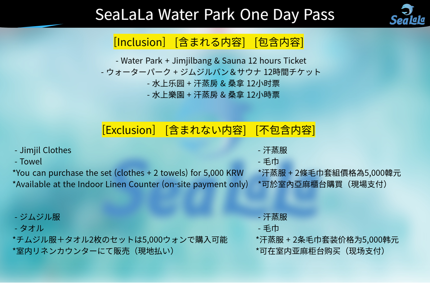 请确保门票包含首尔 Sealala 水上乐园一日通票