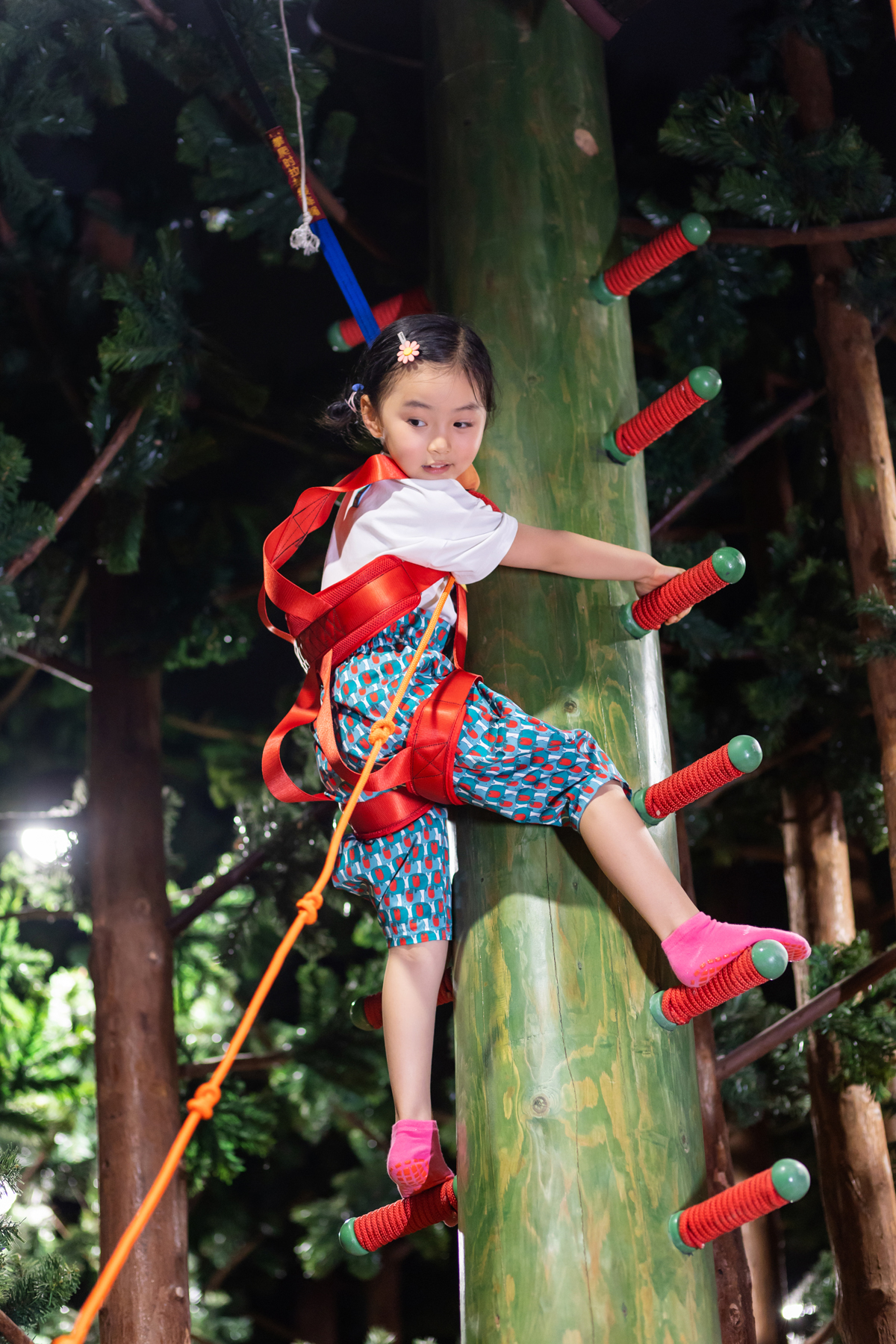爬树教育课程越来越被重视,快来试试自己敢爬多高吧,放心,有安全背带保护你