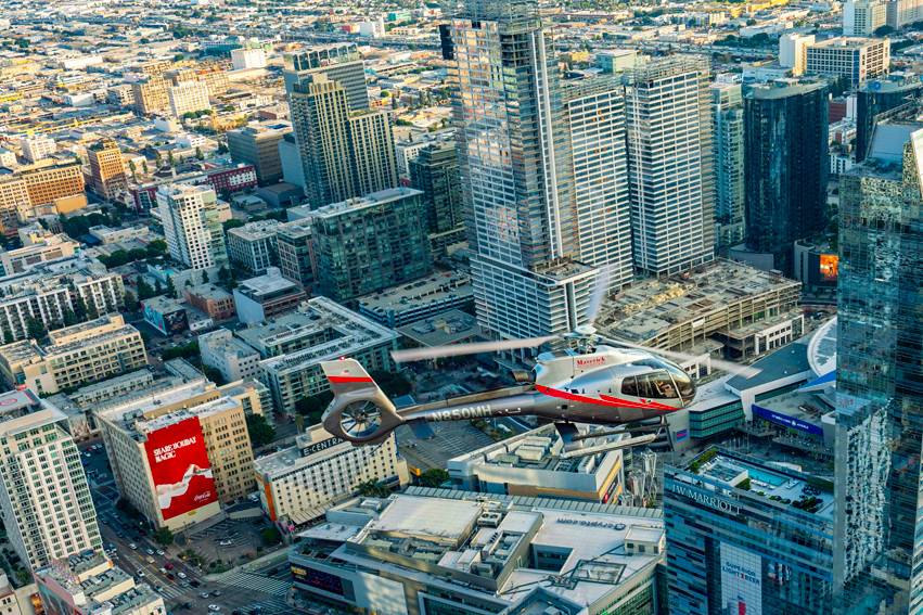 飞越好莱坞山、贝莱尔、罗迪欧大道和加州大学洛杉矶分校,鸟瞰盖提博物馆、好莱坞标志、格里菲斯公园和道奇体育场等地标。见证洛杉矶市中心的天际线,包括 LA Live、洛杉矶体育馆、南加州大学和 Crypto.com 竞技场。