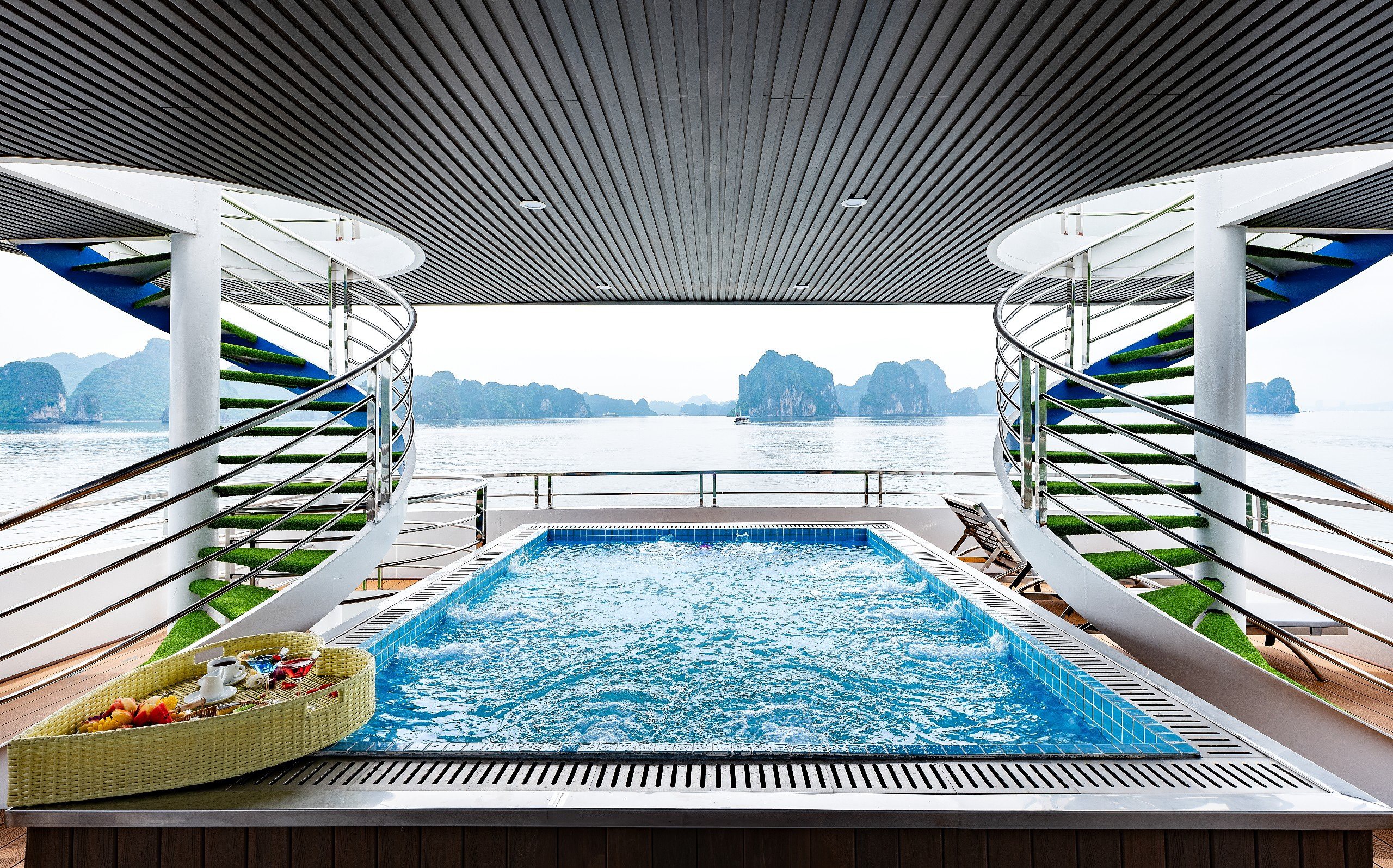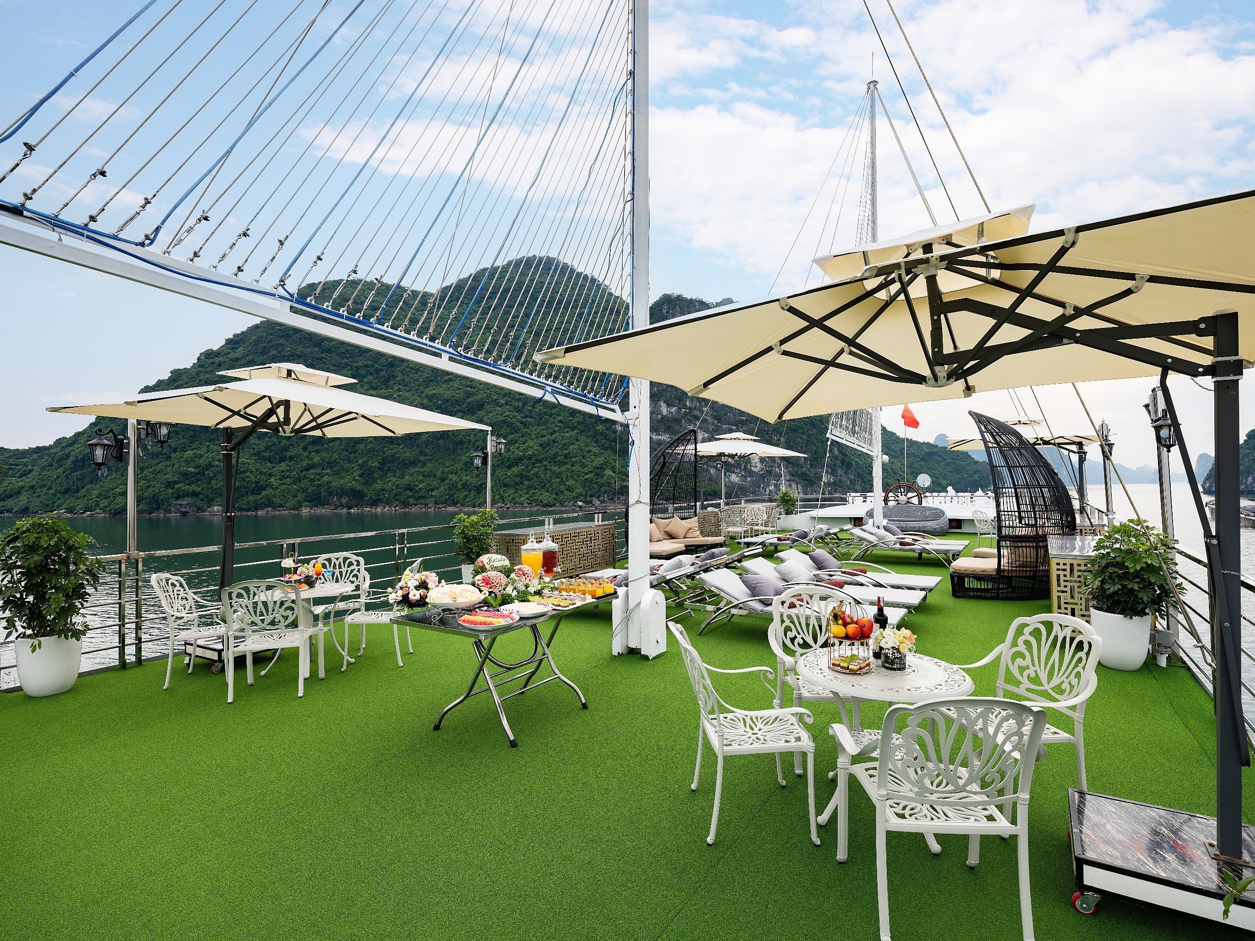宽敞的阳光甲板配有舒适的躺椅,您可以享受日光浴和放松,同时欣赏下龙湾的壮丽景色