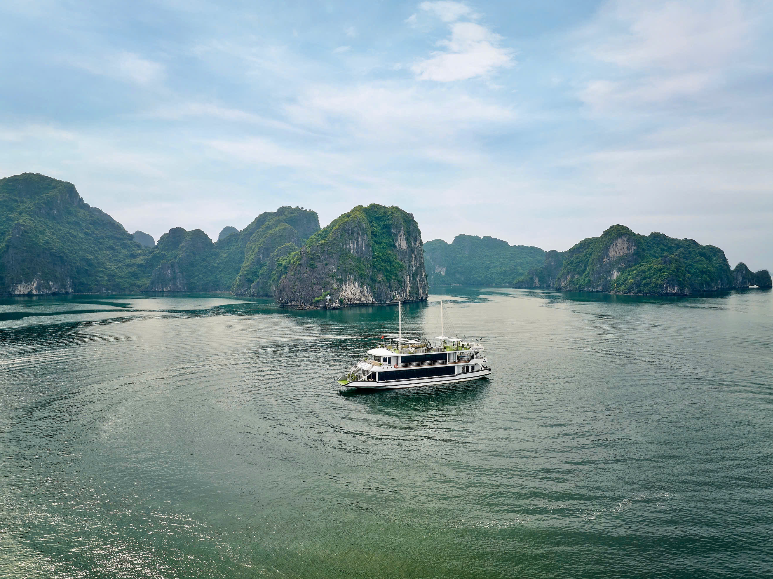 搭乘著名的五星级 Hercules 豪华游轮,开始下龙湾的精致一日游。下龙湾新推出的豪华住宅,设计精致,灰色和白色的搭配引人注目。这艘三层船拥有两间餐厅和一个宽敞的阳光甲板。