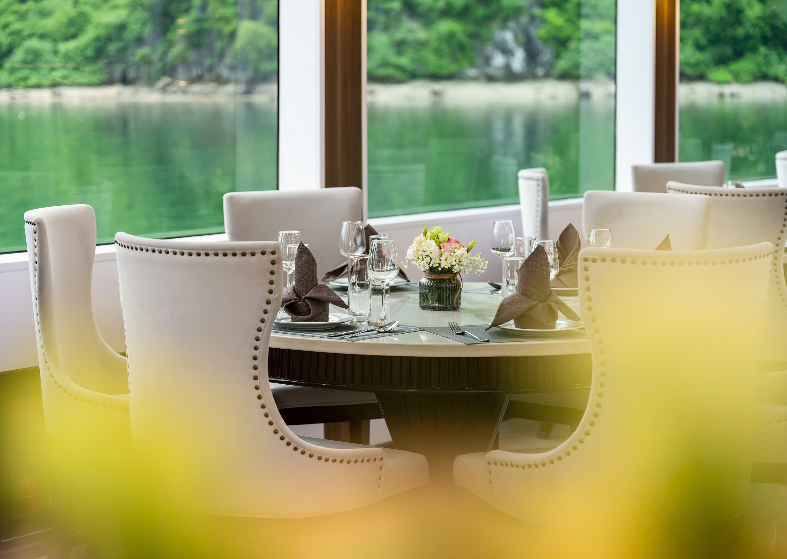 正式布置的餐桌,经过精心清洁并分组排列