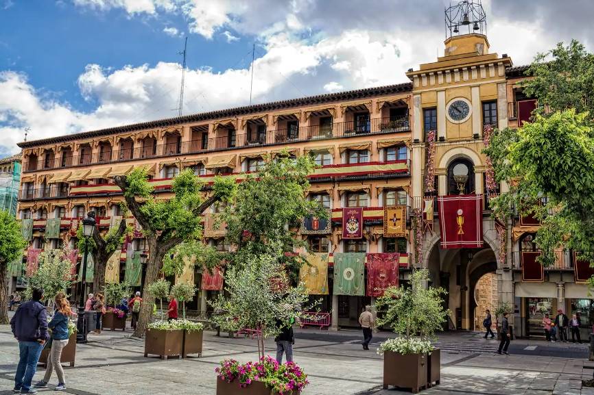 探索托莱多市政厅富丽堂皇的外观,装饰有节日气氛