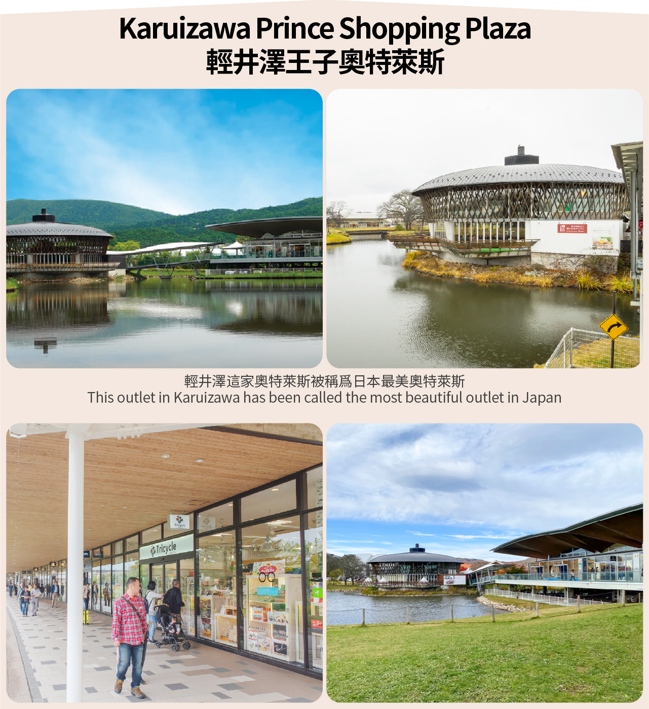 轻井泽王子奥特莱斯被称为日本最美奥特莱斯,这里有着200多家品牌服饰店(包括Prada,Coach,DKNY,TOD'S等)和百余家餐厅,甚至还囊括了一家高尔夫球场和滑雪场。共分为五个区,一共有大约200多家的商铺,从欧美大牌到日本本土的中线品牌一应俱全,价格也比东京,大阪的便宜不少。
