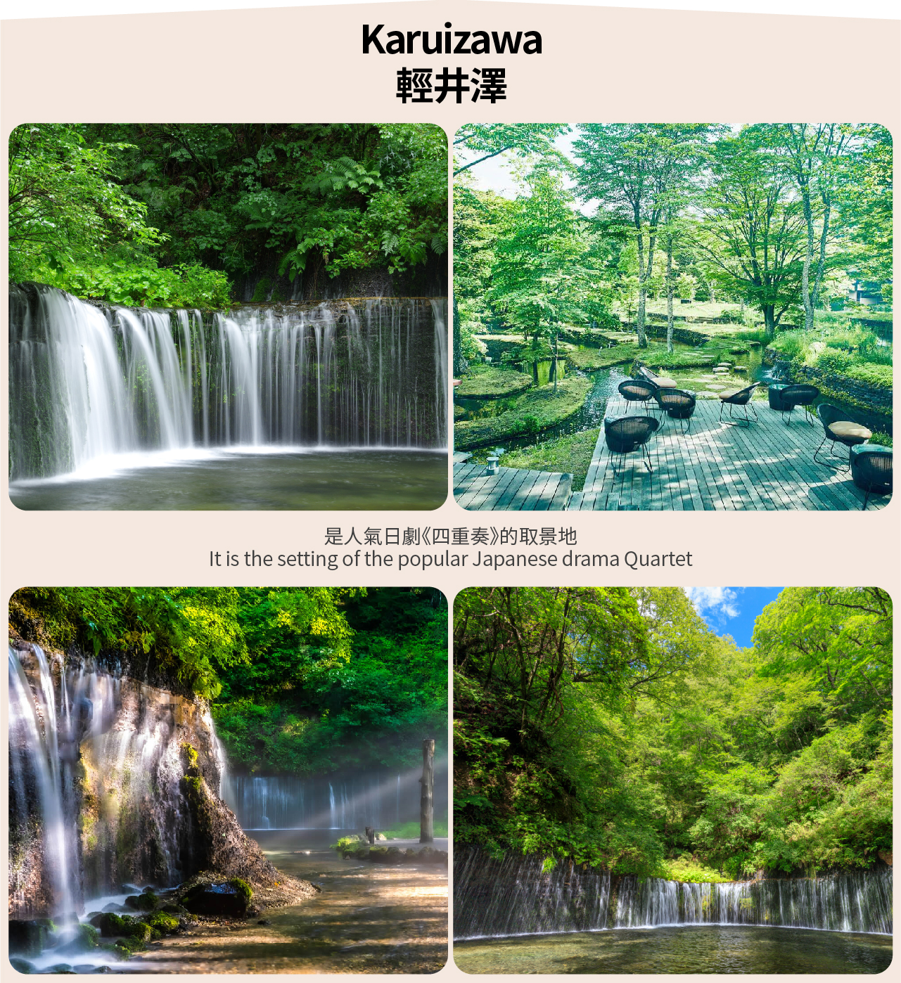 日本度假胜地【轻井泽】是人气日剧《四重奏》的取景地。四周环山景色优美,被誉为生态旅游的最佳地点,这里落叶松和白桦树生长茂盛,自然环境宜人,是日本最有名的豪华别墅区和上流社会聚居地。传说天皇就是在这里邂逅了一生的伴侣。