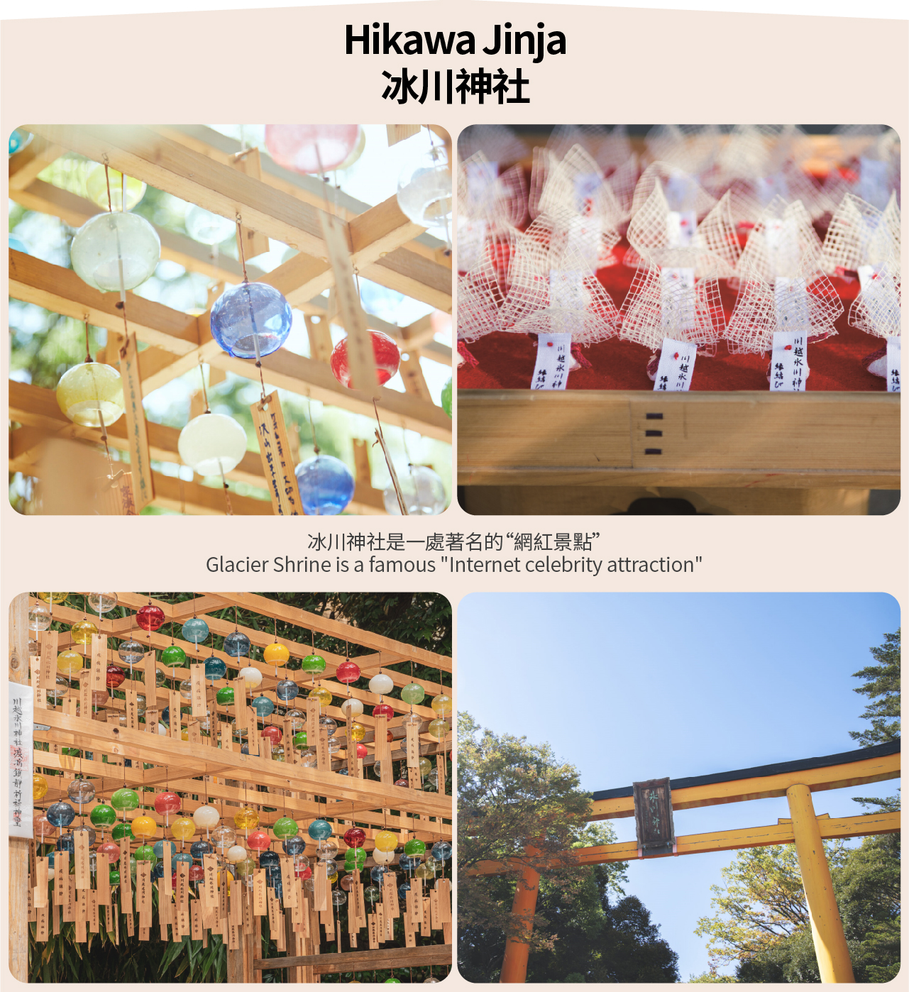 冰川神社是一处著名的“网红景点”。它是日本200多所冰川神社的“总社”,自古以来这里就是求姻缘,求爱情圆满的圣地。(https://res.klook.com/image/upload/v1720683657/admin-markdown/wne3f9j86y1w8qtinnxc.jpg)