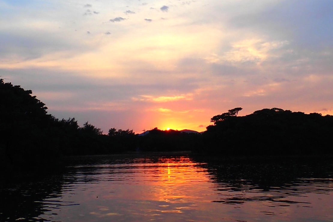 这是在石垣岛的红树林景点一边乘坐独木舟或SUP巡游,一边欣赏夕阳西下的方案。