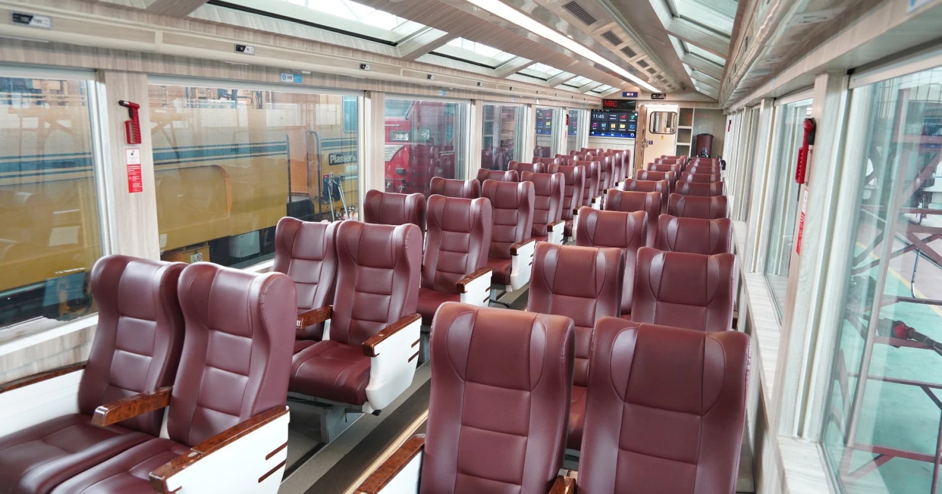 这辆全景火车可以让您旋转座位以面向窗户,增强令人兴奋的体验。