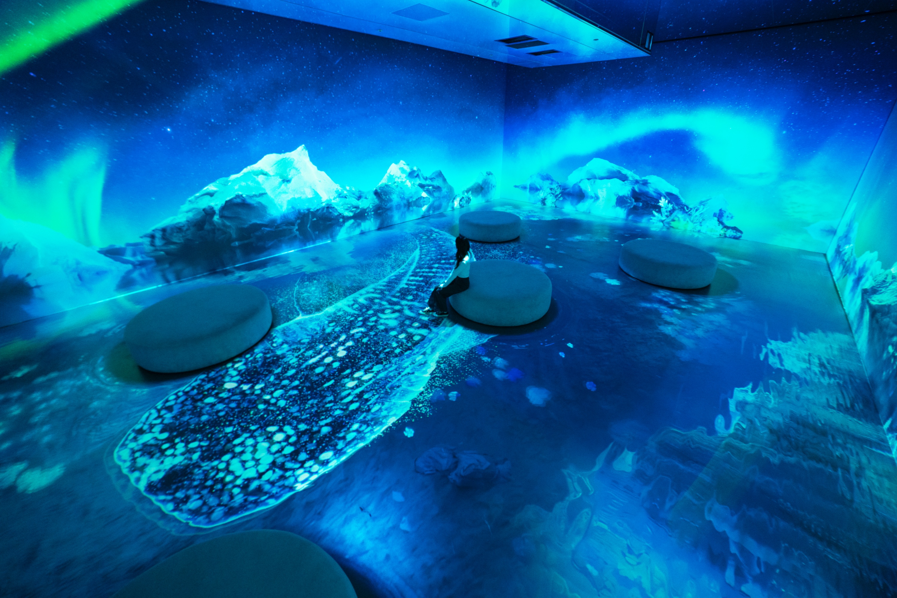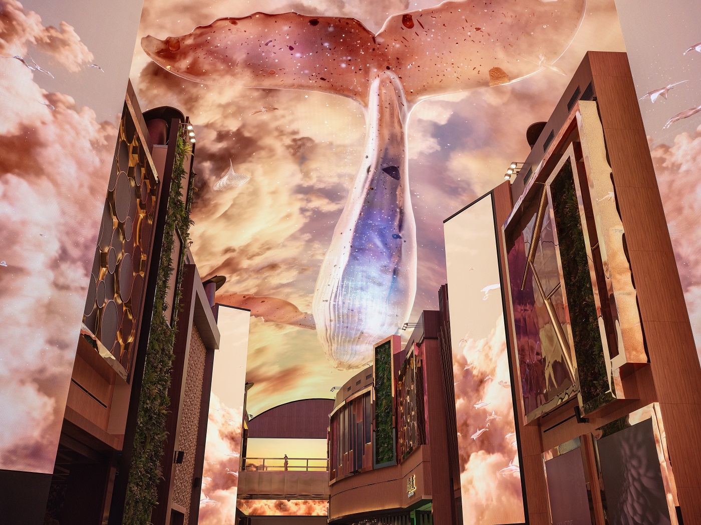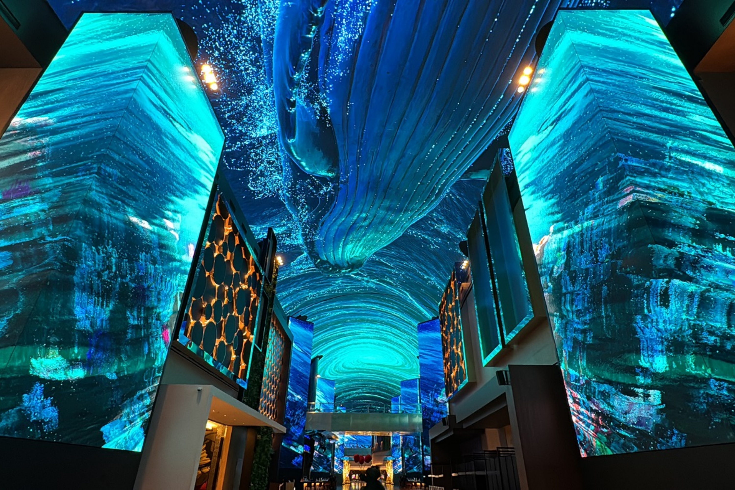 Aurora 是一条沉浸式娱乐街,150 公尺长的 LED 显示器装饰在高高的天花板和墙壁上,呈现出超现实的图像。