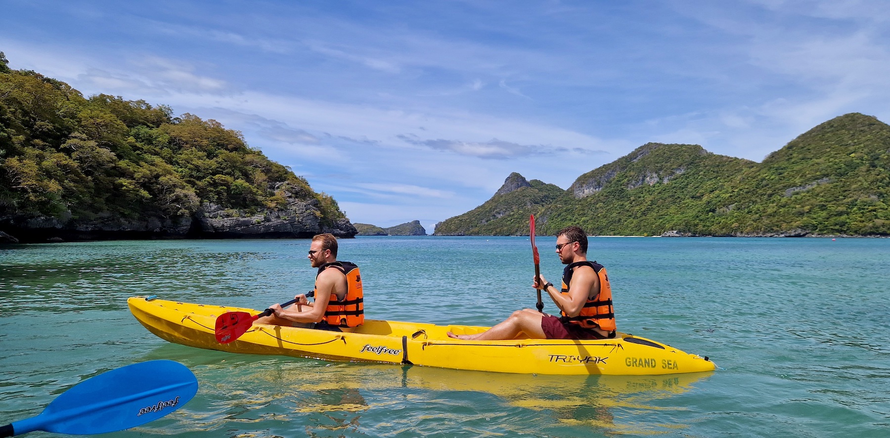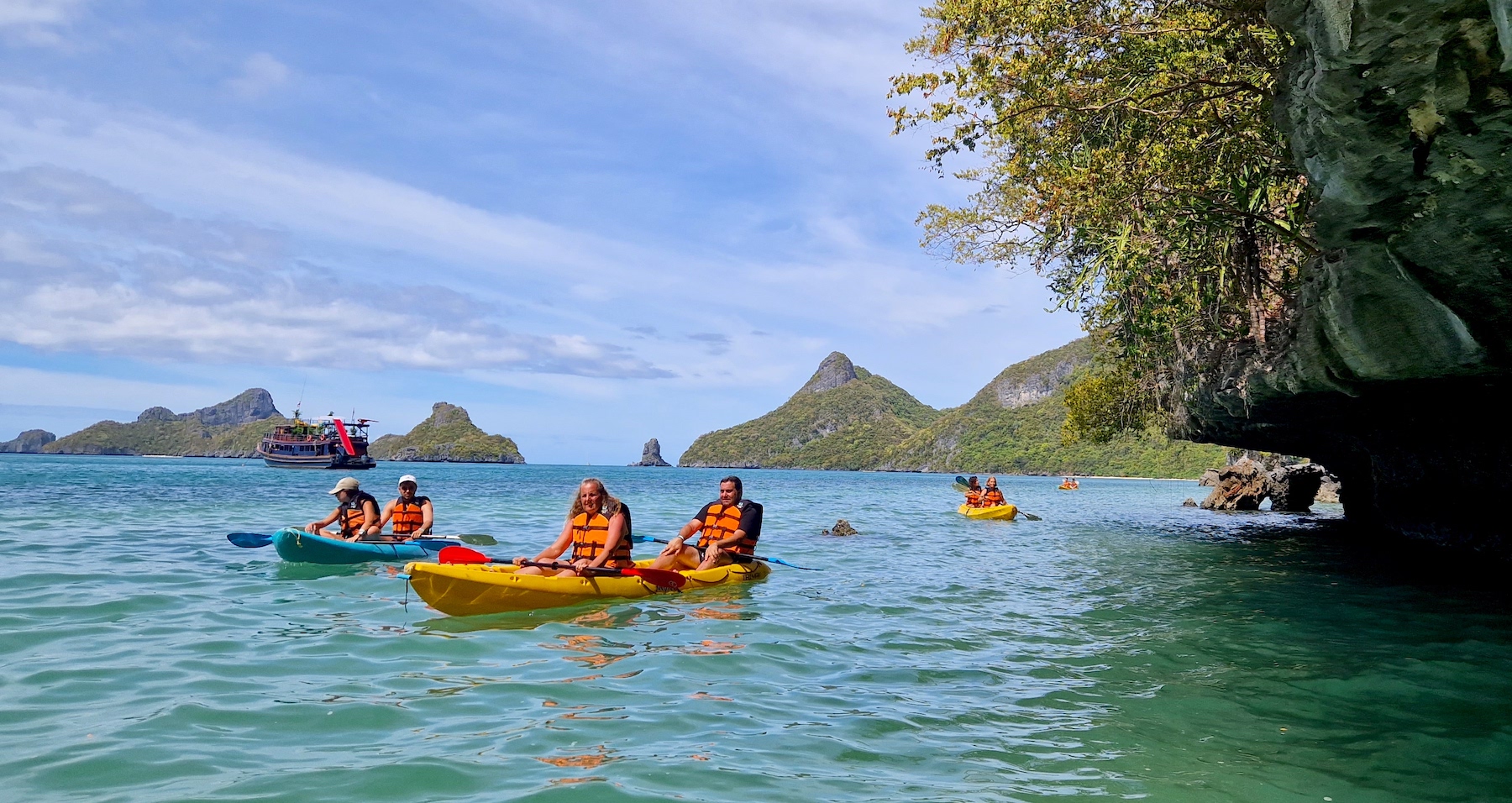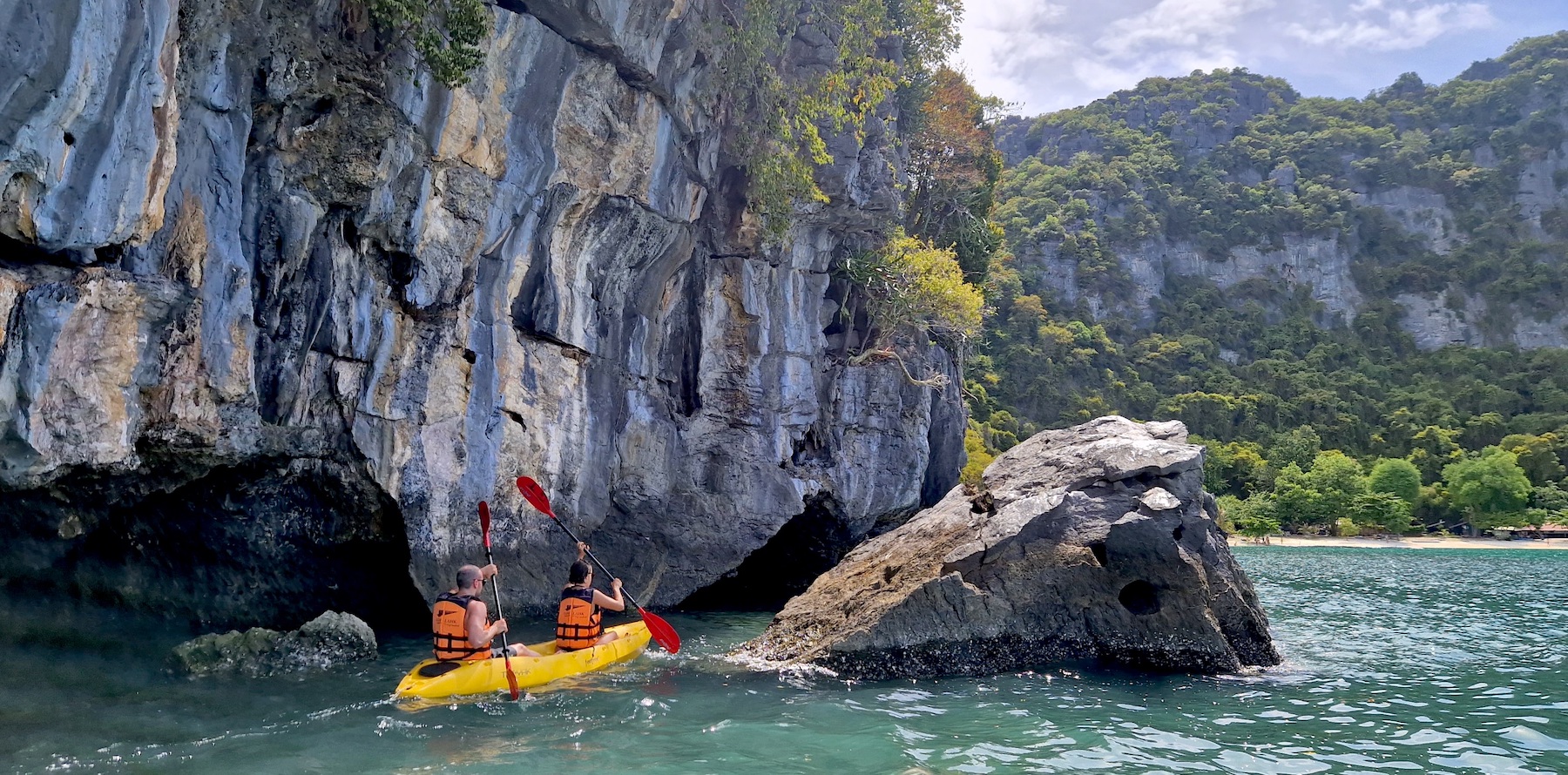 下一站是 Ko Wua Ta Lap。徒步前往泰国最令人难以置信的**观景点**之一,俯瞰 42 个岛屿。享受在海上**划皮艇**的乐趣,探索石灰岩悬崖旁的入口。