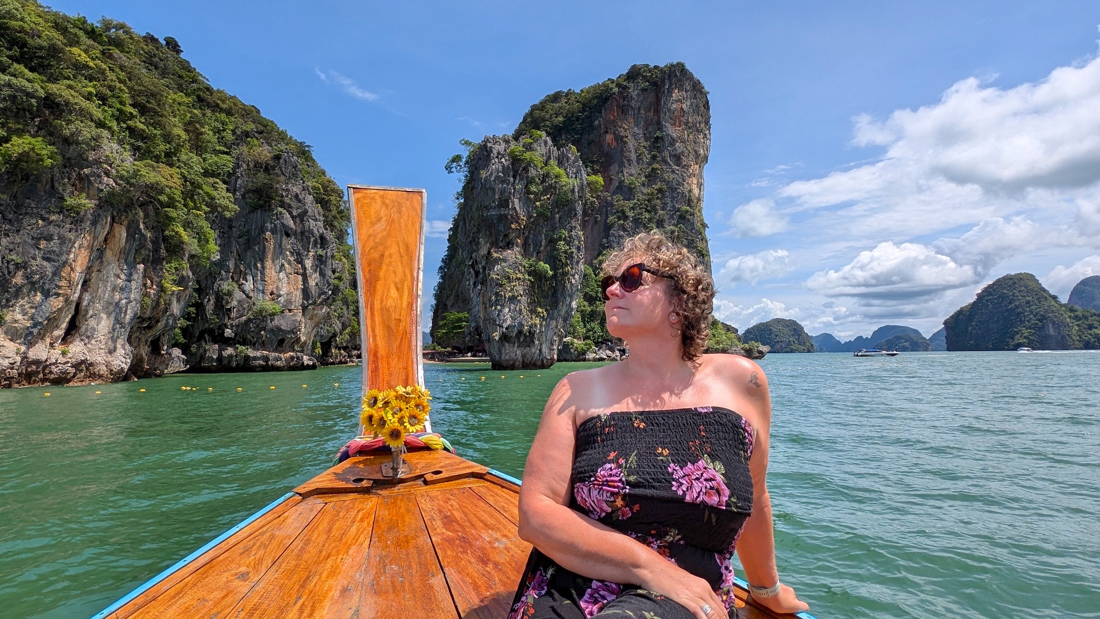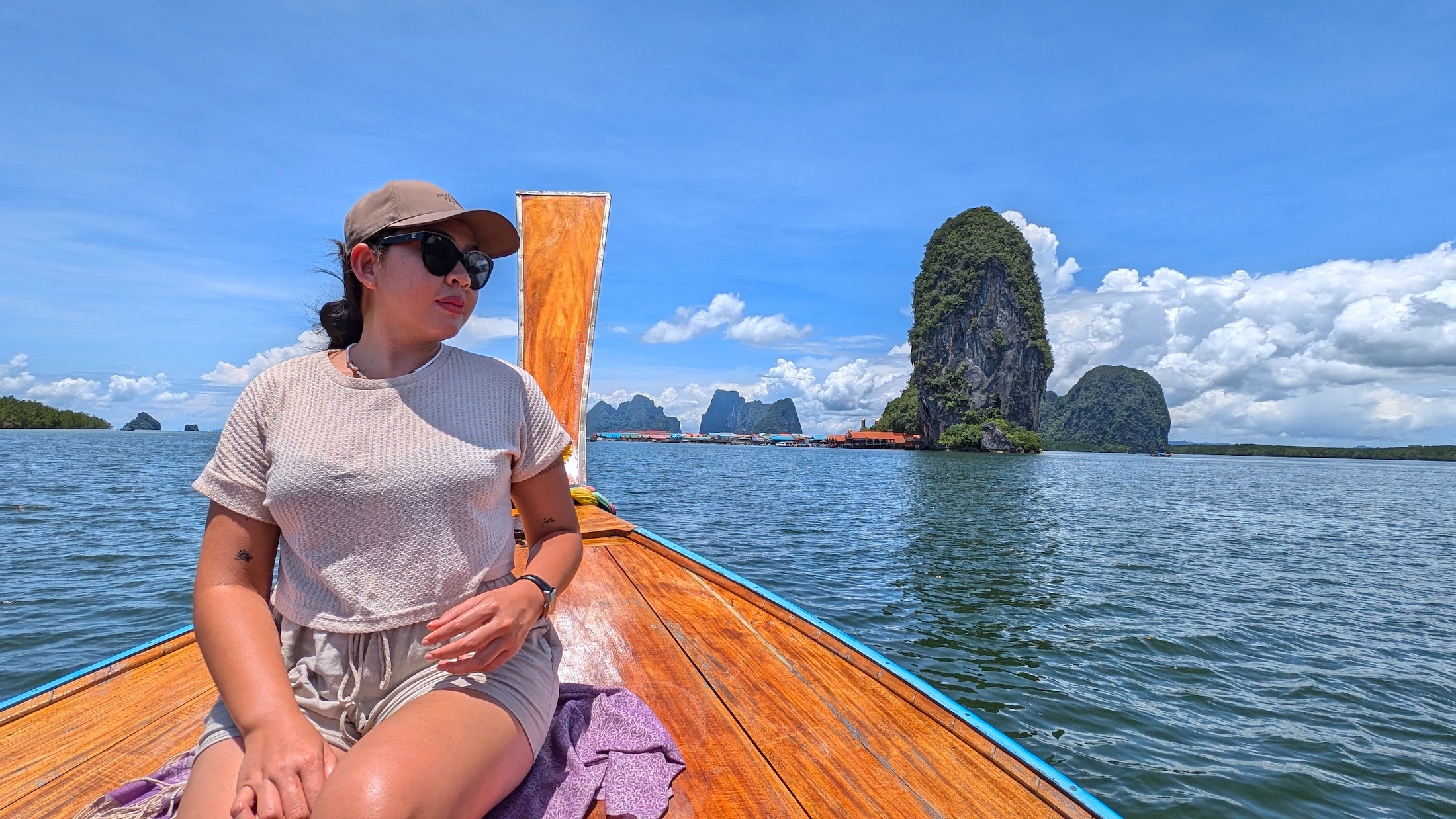在攀牙湾乘坐私人长尾船,这是泰国南部的独特标志。