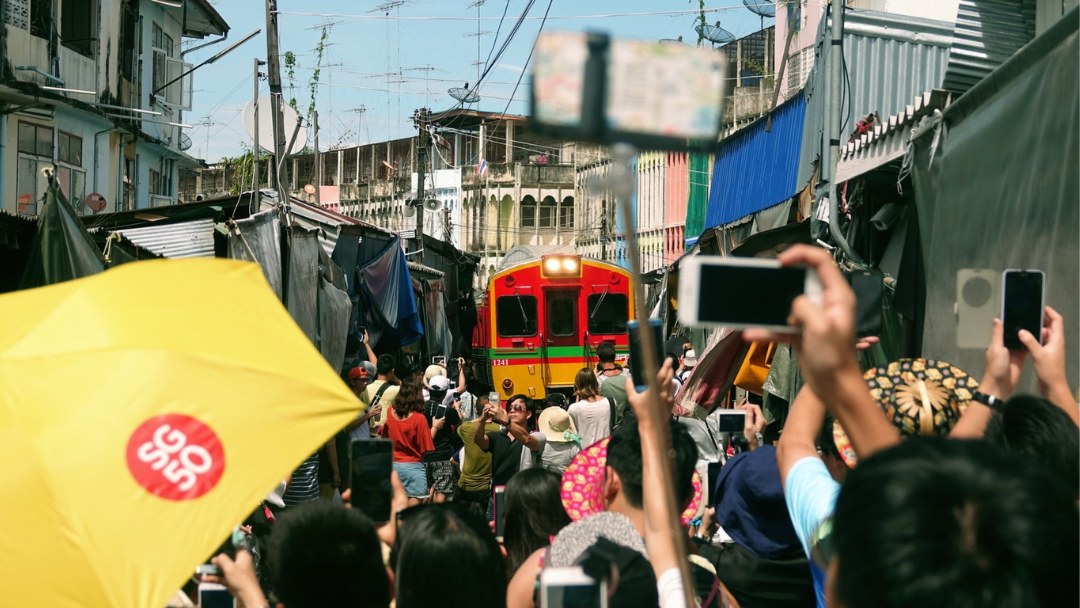当火车穿过熙熙攘攘的摊位时,美功铁路市场一片生机勃勃的混乱